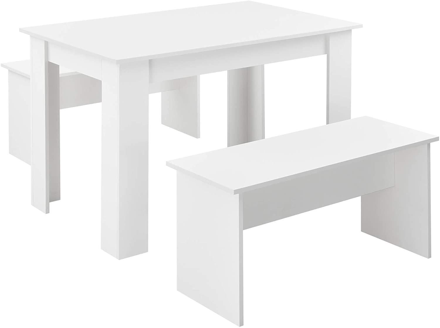 | Beschreibung | Die Sitzgruppe Hokksund besteht aus einem Esstisch und zwei Bänken, die sich harmonisch in Ihr Wohnambiente einfügen. Mit einem modernen Design bietet das Set Platz für bis zu 4 Personen und überzeugt durch einfache Pflege und einen unkomplizierten Aufbau. **Highlights** - Platz für bis zu 4 Personen - Einfacher Aufbau - Pflegeleicht - Wundervolles Design - Markenware aus dem Hause en.casa **Produkteigenschaften** - Maße Tisch (LxBxH): 110 x 70 x 73 cm - Maße Bank (LxBxH): je 86,5 x 33 x 43,5 cm - Tischplattendicke: 1,5 cm - Material: Spanplatte, melaminbeschichtet - Farbe: Weiß **Lieferumfang** - 1x Tisch - 2x Bank - 1x Aufbauanleitung |