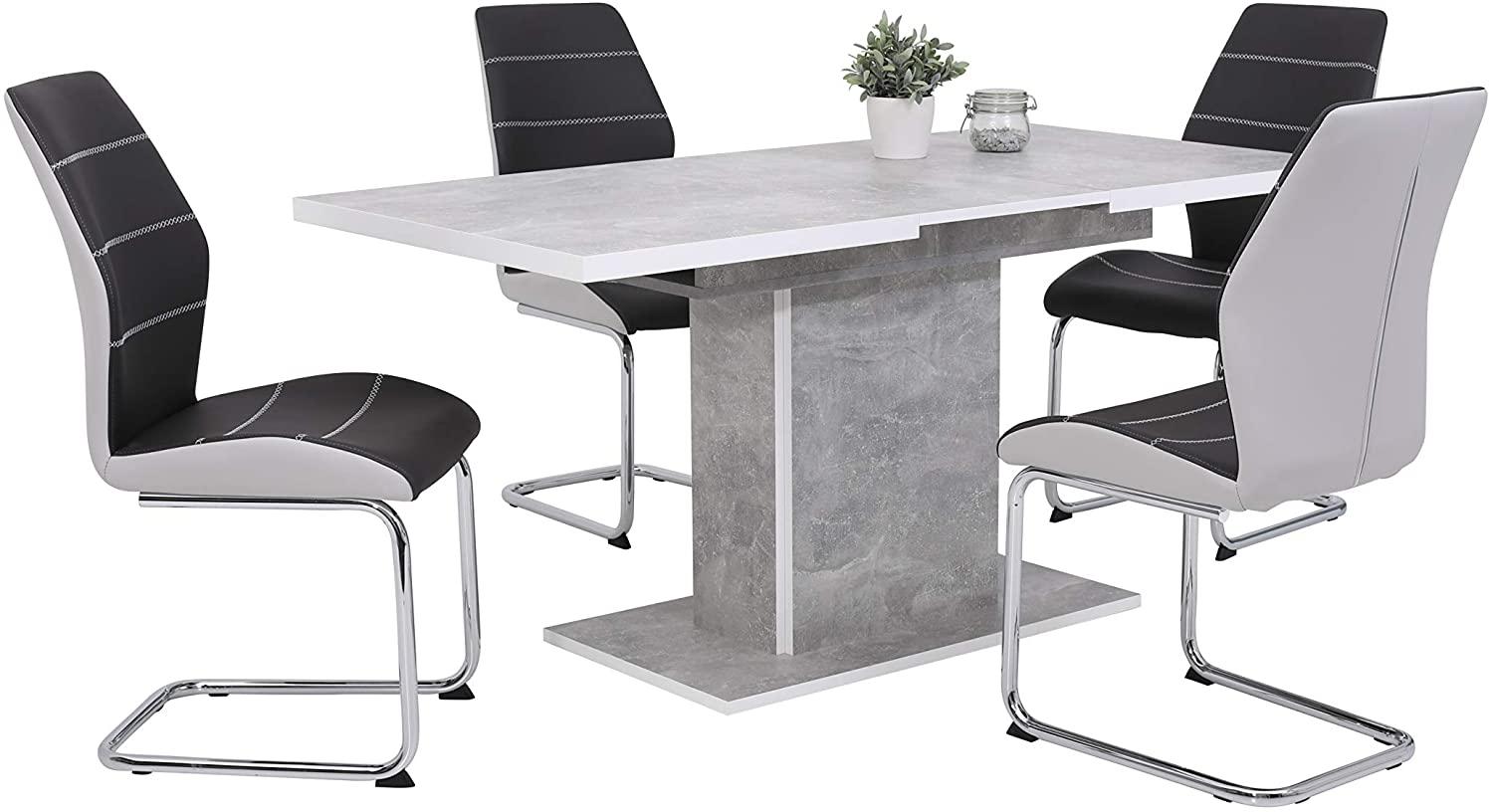 Die Essgruppe Alice begeistert mit ihrem modernen Design und praktischen Funktionen. Der Esstisch in Betonoptik ist ausziehbar auf ca. 160 cm und bietet ausreichend Platz für Ihre Gäste. Die Freischwinger-Stühle Ornella in grau und weiß garantieren festen Sitzkomfort und überzeugen durch ihr elegantes Kunstleder und das verchromte Metallgestell. **Highlights** - Moderner Esstisch in Betonoptik mit ausziehbarer Einlegeplatte - Freischwinger-Stuhl Ornella in grau und weiß mit Kreuzsteppnaht im Kunstlederbezug - Verchromtes Metallgestell für Standfestigkeit - Tischmaße: H 76 cm x B 120 / 160 cm x T 80 cm - Stuhlmaße: H 97 cm x B 46 cm x T 63 cm, Sitzhöhe 48 cm, Sitztiefe 46 cm **Produkteigenschaften** - Material Esstisch: Holzwerkstoff - Material Stuhl: Metallgestell Rundrohr, verchromt - Farbe Stuhl: Schwarz / Weiß - Bezug Stuhl: Kunstleder (97 % Polyurethan, 3 % Baumwolle) - Belastbarkeit Stuhl: max. 120 kg **Lieferumfang** - 1x 5-teilige Essgruppe Alice (zerlegt geliefert, mit Aufbauanleitung)