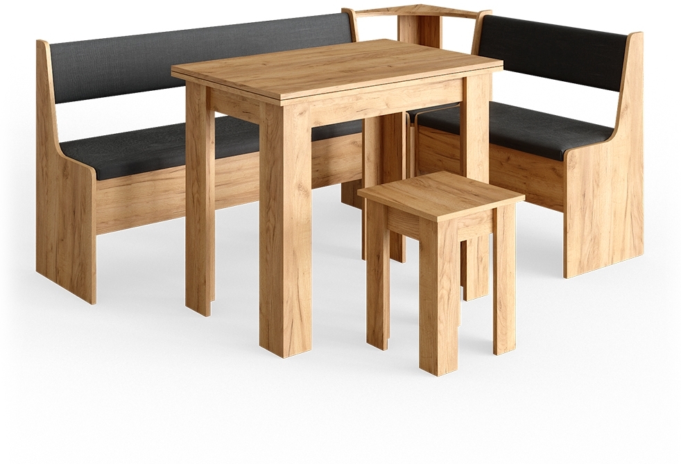 Die Eckbankgruppe "Roman" mit Tisch ist nicht nur eine praktische Esstischlösung, sondern auch ein echter Hingucker für Ihr Esszimmer oder Ihre Küche. Der klassische Stil und die gepolsterten Sitzflächen und Rückenlehnen bieten höchsten Komfort und laden zu gemütlichen Mahlzeiten mit Familie und Freunden ein. Diese fertige Lösung verleiht jedem Raum ein behagliches Ambiente und ist in verschiedenen Ausführungen erhältlich. Gönnen Sie sich ein Stück Gemütlichkeit und entspannte Stunden beim Essen mit Ihren Liebsten - mit der Eckbankgruppe "Roman". --- **Technische Details:** **Farben:** Goldkraft Eiche, Anthrazit **Abmessungen:** 136,6 x 80 x 60 cm (BxHxT) **Material:** Spanplatte, 16 mm **Oberfläche:** Melaminharzbeschichtung **Artikelgewicht inkl. Verpackung:** 82.53 kg. **Artikelgewicht:** 78.57 kg. --- LIEFERUMFANG: Eckbankgruppe, Montageanleitung, Montagematerial