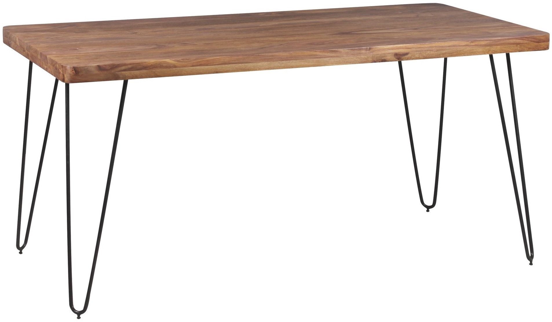 - Die schwarzen Haarnadelbeine aus Metall sorgen für einen modernen Kontrast zur Holzoberfläche und verleihen dem Tisch ein harmonisches Gesamtbild.