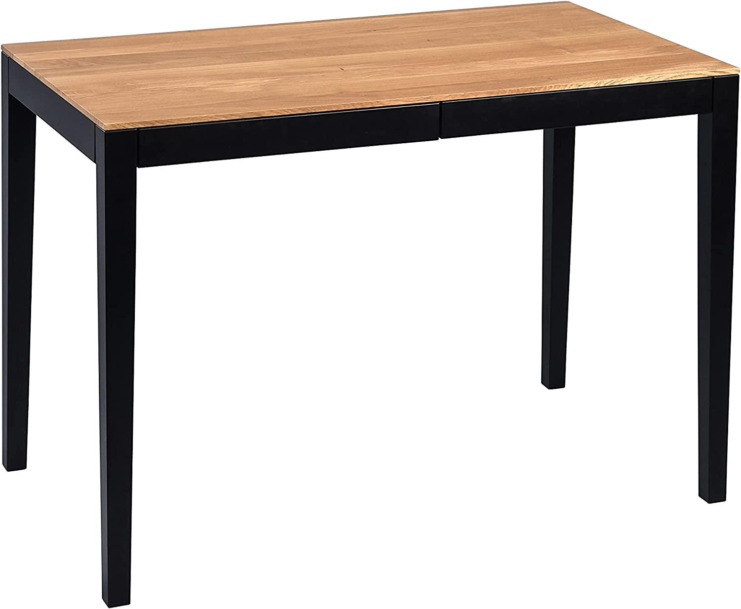 Hochwertig gefertigter Schreibtisch aus massivem Wildeichen- und Buchenholz. Die geölte Tischplatte aus massiver Wildeiche verleiht dem Holz eine schöne und kräftige Farbe und schützt gleichzeitig vor Schmutz, Wasser und Verschleiß. Die massiven, schwarz lackierten Buchenbeine sorgen für Stabilität. Der Schreibtisch verfügt über zwei Schubladen mit Metallauszug. **Highlights** - Tischplatte aus massiver Wildeiche, geölt - Schubladen mit Metallauszug - Massivholzbeine aus Buche, schwarz lackiert - Schützt vor Schmutz, Wasser und Verschleiß - Hochwertige Verarbeitung **Produkteigenschaften** - Maße (B/H/T): 110 x 75 x 60 cm - Material: Wildeiche / Buche - Farbe: Braun / Schwarz **Lieferumfang** - Schreibtisch - Lieferung in zwei oder mehr Kartons
