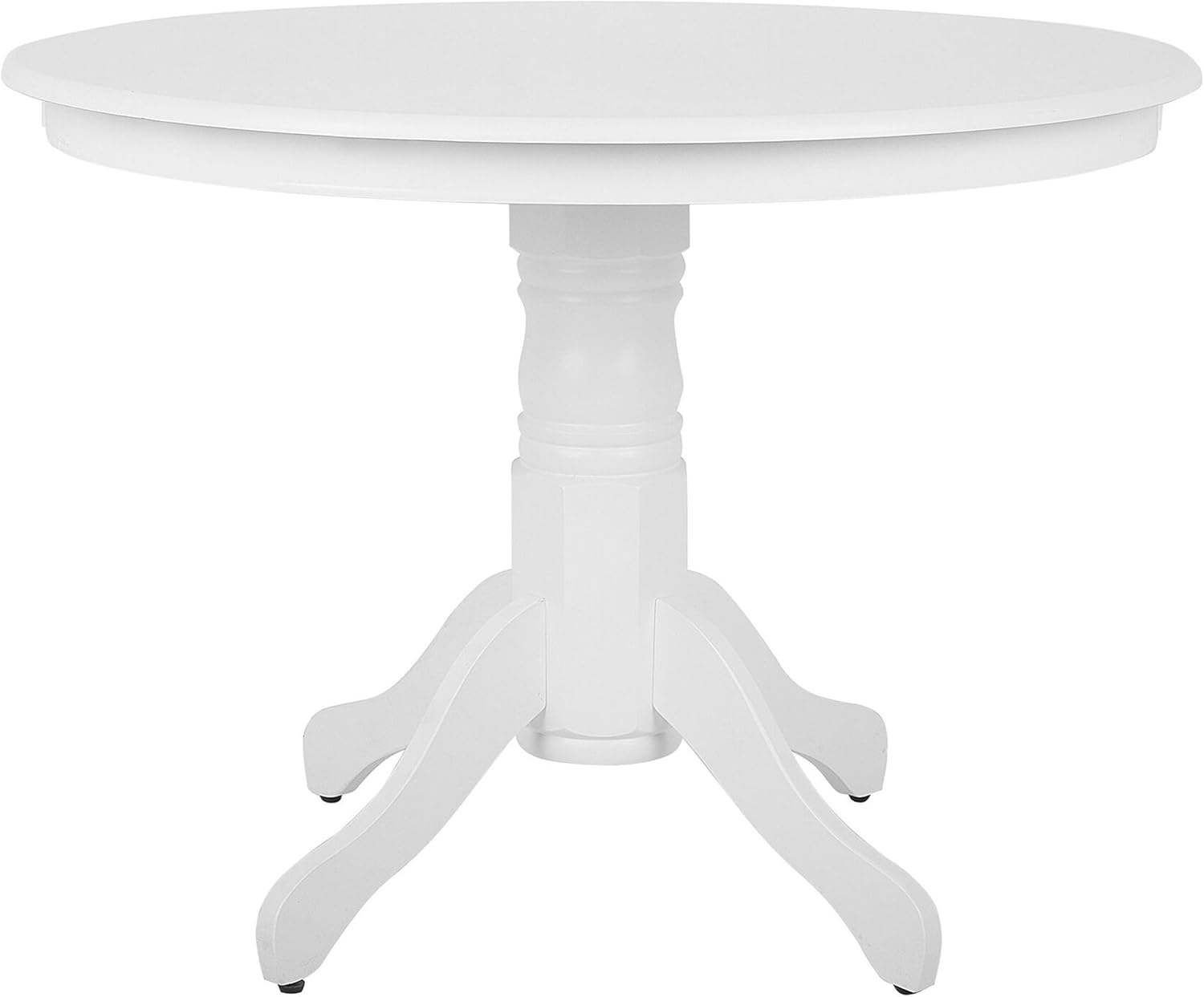 Stilvoller runder Esstisch im Landhausstil mit einer glatten, lackierten Tischplatte aus stabiler MDF-Platte. Der Tischfuß aus Gummibaumholz mit subtilen Verzierungen schafft ein warmes Ambiente und wird zum Mittelpunkt des Familienlebens. Mit einem Durchmesser von 100 cm und einer Höhe von 76 cm bietet er ausreichend Platz für gesellige Runden. **Highlights** - Elegante Optik: Verleiht Ihrem Essbereich einen stilvollen Akzent. - Besonders pflegeleicht und langlebig: Ideal für den täglichen Gebrauch. - Schutzkappen: Schützen Ihren Boden vor Kratzern. - Stabiles und strapazierfähiges Gestell: Gewährleistet eine hohe Stabilität. - Retro Stil: Fügt sich harmonisch in verschiedene Einrichtungsstile ein. **Produkteigenschaften** - Typ: Esszimmertisch - Stil: Klassisch - Farbe: Weiß - Material: MDF-Platte - Zusätzliches Material: Gummibaumholz - Gestellmaterial: Massivholz - Tischplattenmaterial: Holzwerkstoff - Form: Rund - Finish: Lackiert - Abmessungen: - Durchmesser: 100 cm - Höhe: 76 cm - Gewicht: 27 kg - Max. Belastung: 100 kg - Montage: Nicht montiert, 20 - 40 Min. **Lieferumfang** - 1 x Tisch