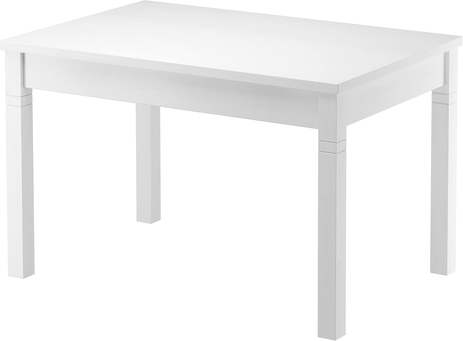 Wählen Sie den ERST-HOLZ Küchentisch, einen klassischen Esstisch aus massivem Kiefernholz, der für 4 bis 6 Personen geeignet ist. Mit stabiler Konstruktion und dekorativen Querrillen fügt er sich harmonisch in verschiedene Einrichtungsstile ein. Die waschweiß lackierte Oberfläche ist schmutz- und feuchtigkeitsresistent und lässt die natürliche Holzstruktur durchscheinen. **Highlights** - Klassischer Holztisch aus massiver Kiefer für Langlebigkeit - Stabile und robuste Konstruktion für unkomplizierte Nutzung - Ideal für 4 bis 6 Personen - Waschweiß lackierte Oberfläche, die die Holzstruktur sichtbar macht - Hergestellt aus nachhaltig bewirtschafteten Wäldern in Europa **Produkteigenschaften** - Maße (HxBxT): ca. 76,5 x 120 x 80 cm - Tischplatte: ca. 120 x 80 x 2,5 cm - Beine: ca. 5,5 x 5,5 x 74 cm - Resistent gegen Schmutz und Feuchtigkeit - Naturmaterial, das sich mit der Zeit verändern kann **Lieferumfang** - Küchentisch - Lieferung ohne Deko