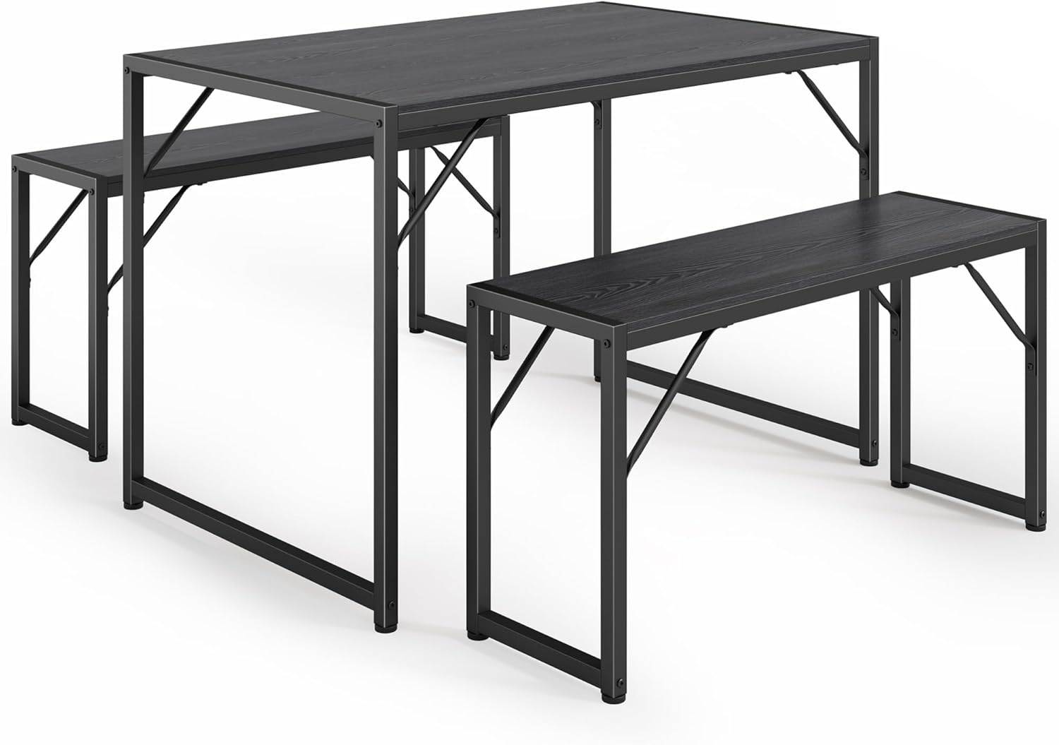 Bealife Esstisch 3er-SetKüchentisch mit 2 Bänken, platzsparend, stabiles Stahlgestell, 3-teilig, höhenverstellbare Tischfüße, Pflegeleichte Oberfläche, für Esszimmer und Küche (Schwarz)
