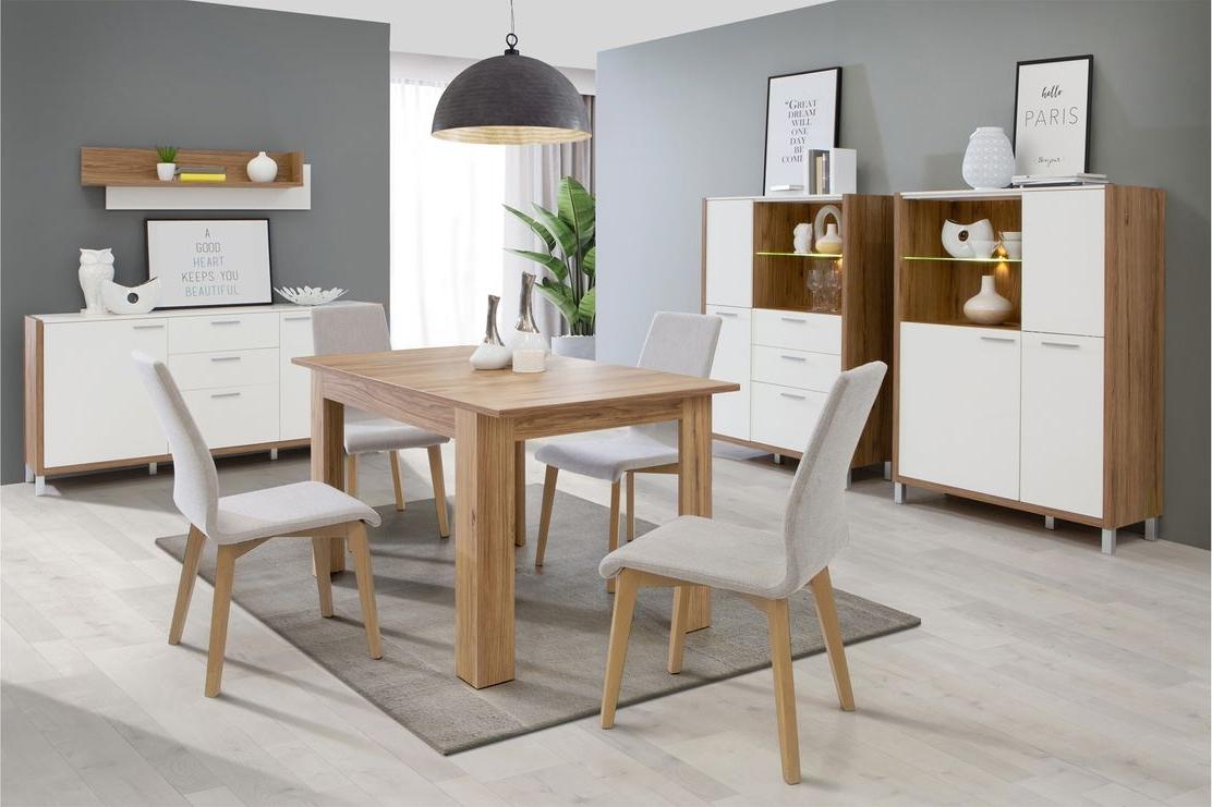 | Name | Esszimmer Felix 40 weiß Catania Eiche 5-teilig Ausziehtisch Vitrine mit Beleuchtung |