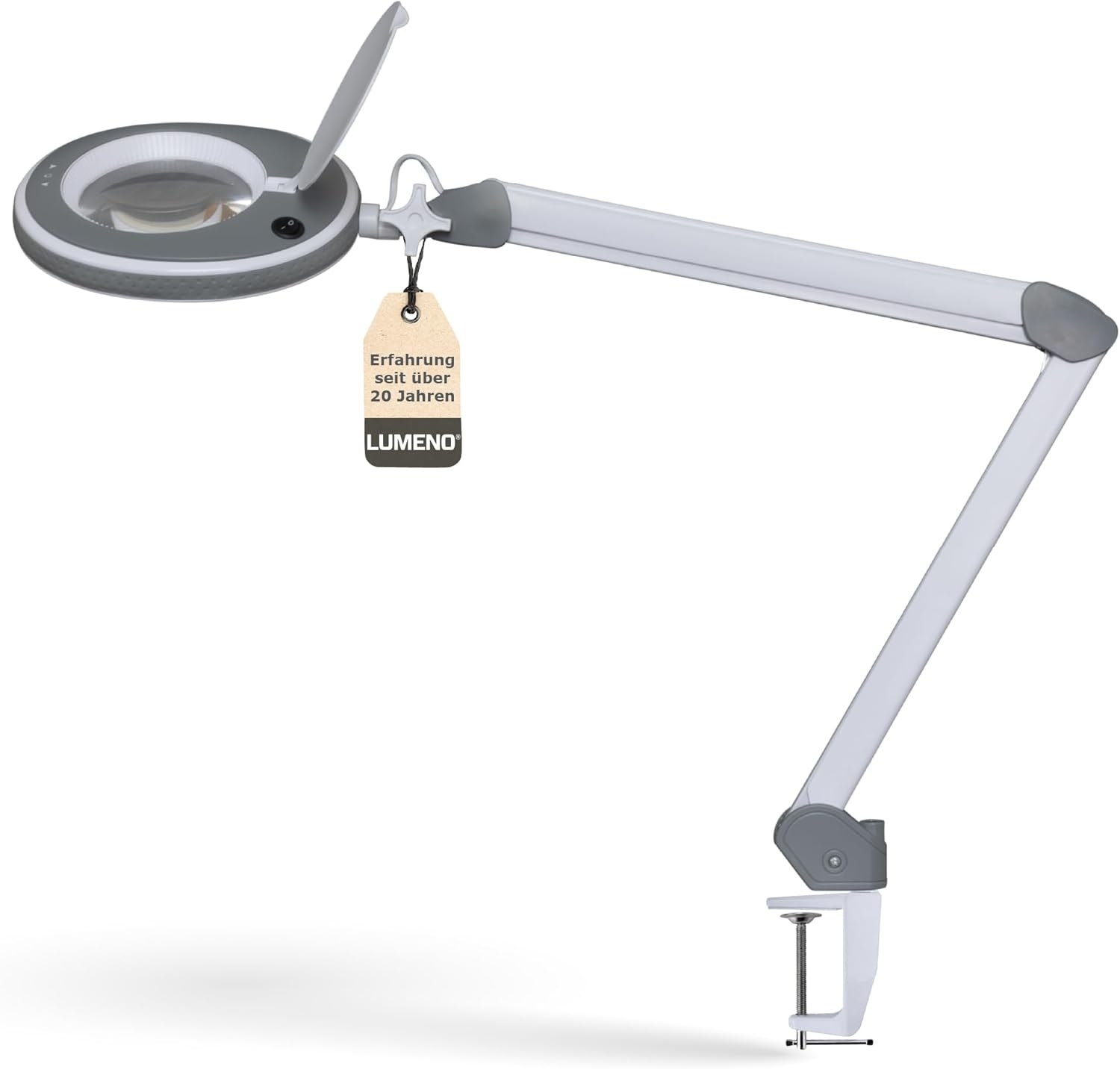 **Professionelle Lupenleuchte Modell 821X von Lumeno, mit regelbarer Helligkeit und kristallklarer Glaslinse in 3 oder 5 Dioptrien.** Lumeno bietet mit dem Premiummodell 821X eine Lupenleuchte für professionelle Anwendungen. Dank der speziellen Bauweise hat die Armmechanik einen großen Arbeitsradius, ist leicht schwenkbar und birgt, anders als herkömmliche Lupenleuchten, keine Klemmgefahr für die Finger. Hervorzuheben ist an dieser Stelle auch, dass die Lampe von den versteckten Federn genau in der Position gehalten wird, in der Sie sie eingestellt haben. Die Konstruktion sorgt außerdem dafür, dass die Lampe schnell und einfach gereinigt werden kann. Die Besonderheit: Anders als bei anderen Lupenleuchten lässt sich die LEDs der Serie 821X in 6 Helligkeitsstufen regeln. Hierfür befindet sich am Lampenkopf ein Touch-Sensitive-Bedienelement, welches auch bei Verwendung von Latexhandschuhen reagiert. Somit ist diese Lampe auch ideal für die Kosmetik oder Fußpflege. Energieeffiziente LED der neusten Gerneration sorgen für eine gleichmäßige Ausleuchtung mit 820 Lumen. Dank einer Lebensdauer von bis zu 25.000 Stunden lassen sich diese Vorteile extrem lange genießen. Erstmalig wird in diesem Modell auch eine kristallklare Glaslinse serienmäßig verbaut. Diese sorgt für eine klare Abbildung ohne Farbstich bei minimaler Verzerrung. **Die Linse ist in zwei Stärken lieferbar:** 3 Dioptrien (1,75fache Vergrößerung) 8213 5 Dioptrien (2,25fache Vergrößerung) 8215 Insgesamt sticht diese Lupenleuchte aufgrund ihrer exklusiven Qualität und dem formschönen Design hervor. Auch die praktische Gummischutzkante wurde aus der vorangegangenen Serie übernommen und sorgt für verbesserte Griffigkeit zur besseren Ausrichtung und einen gewissen Schutz gegen leichte Stöße. Durch die jahrelange Erfahrung des Herstellers bleibt die Lampe dabei außerordentlich praxistauglich. Alle Bedienelemente sind praktisch angeordnet und dadurch gut erreichbar. Die im Lampenkopf kreisförmig um die Linse angebrachten LEDs haben trotz enormer Leuchtkraft einen mit 10 Watt nur sehr geringen Stromverbrauch und bieten eine gleichmäßige Ausleuchtung des Arbeitsbereiches. Der Betrieb der Lupenleuchte erfolgt mit ungefährlicher 20 V Kleinspannung über ein separates Netzteil. Im Lieferumfang befindet sich eine praktische Tischklemme zur Montage. Weiteres Zubehör wie Stativ, Tisch- oder Wandhalterung ist optional erhältlich. **Lieferumfang:**Lupenleuchte 821XGR, Netzteil (20 V / 0,5 A), Tischklemme, Anleitung **Weitere Details finden Sie unter Spezifikationen**