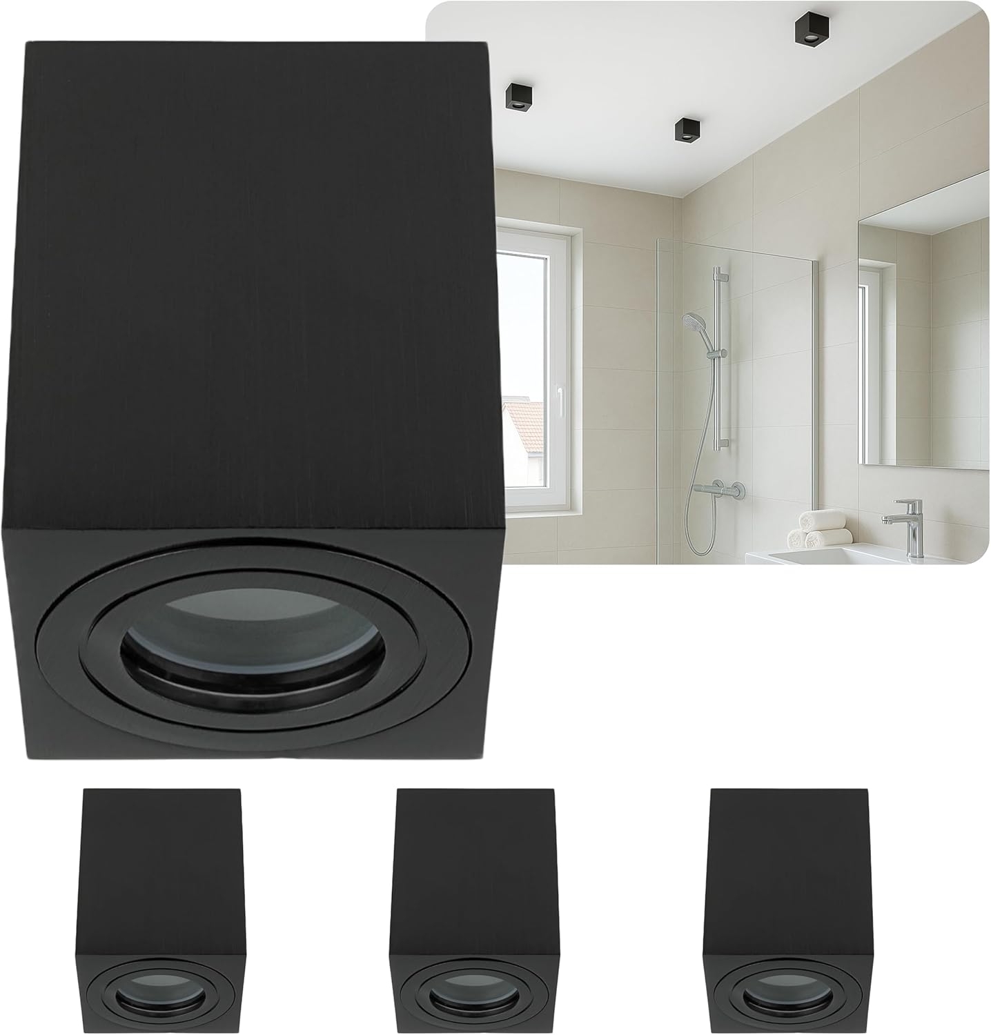 | Name | Sweet LED Aufbauleuchte 4er Set GU10 für Bad & Küche IP44 Deckenspots eckig schwarz 230V, spritzwassergeschützt, ohne Leuchtmittel, Aufbaustrahler LED, Aufbauspot, Deckenleuchte |