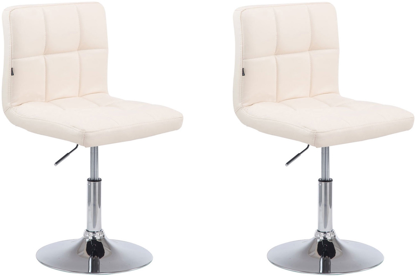 Das 2er Set Lounger Palma V2 in creme bietet Ihnen eine stilvolle und bequeme Sitzgelegenheit. Mit üppig gepolsterten Sitzflächen und robusten Metallgestellen in Chrom-Optik sind diese Lounger nicht nur optisch ansprechend, sondern auch funktional. Die drehbaren Sitze sind stufenlos höhenverstellbar und sorgen für eine angenehme Sitzposition. Ein Bodenschoner schützt Ihren Boden vor Kratzern. **Highlights** - Stufenlos höhenverstellbar - 360° drehbarer Sitz - Angenehme Sitzposition durch Rückenlehne - Belastbarkeit: 135 kg - Pflegeleichte Oberflächen **Produkteigenschaften** - Material: Kunstleder (100% Polyurethan) - Maße: Gesamthöhe 74 – 88 cm, Gesamtbreite 44 cm, Gesamttiefe 49 cm - Sitzhöhe: 41 – 55 cm, Sitzfläche (BxT): 44 x 39 cm - Höhe Rückenlehne: 33 cm - Max. Belastbarkeit: 135 kg - Pflegeleichte Oberflächen - Empfohlene Reinigung mit lauwarmem Wasser und Baumwolltuch