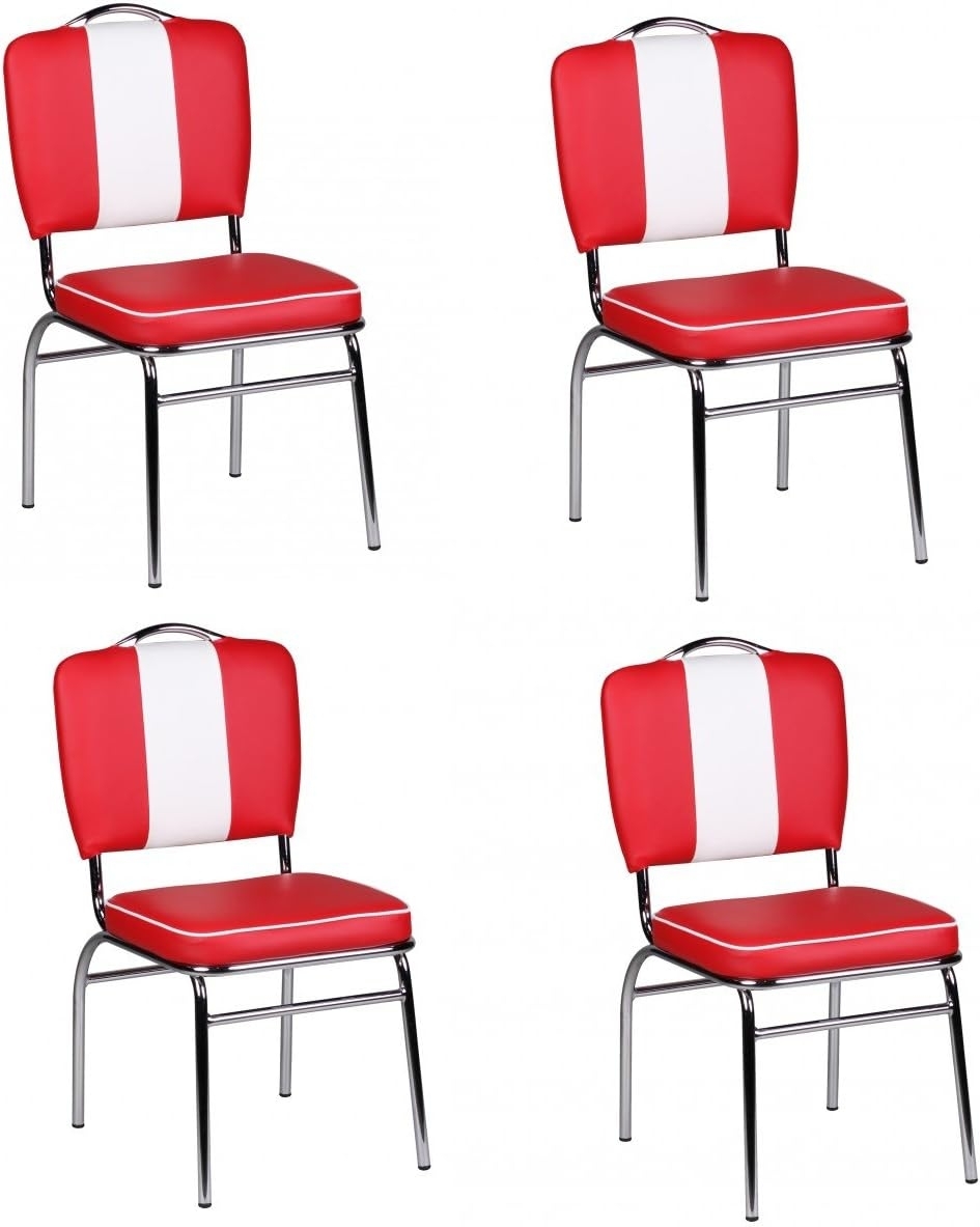 Die 4er-Set Esszimmerstühle KING im American Diner Stil bringen den Charme der 50er Jahre in Ihren Essbereich. Mit einer maximalen Belastbarkeit von 120 KG und einer üppigen Polsterung bieten sie hohen Komfort. Die Stühle sind aus Leder-Optik und Chrom gefertigt und überzeugen durch ihre farblich abgesetzten Nähte. **Highlights** - Retro Vintage Design im American Diner Stil - Maximale Belastbarkeit: 120 KG - Integrierter Griff an der Rückenlehne - Elegante Standfüße - Leicht verständliche Aufbauanleitung für zügige Montage **Produkteigenschaften** - Bezug: Leder Optik (Oberfläche: 100% Polyurethan, Grundgewebe: 100% Baumwolle) - Fuß: Chrom - Maße: H 90 cm, B 47 cm, T 45 cm, Sitzhöhe 47 cm, Rückenhöhe 43 cm, Rücken 47 x 37 cm, Sitzfläche 46 x 42 cm **Lieferumfang** - 4 Retro Stühle - Ohne Dekoration