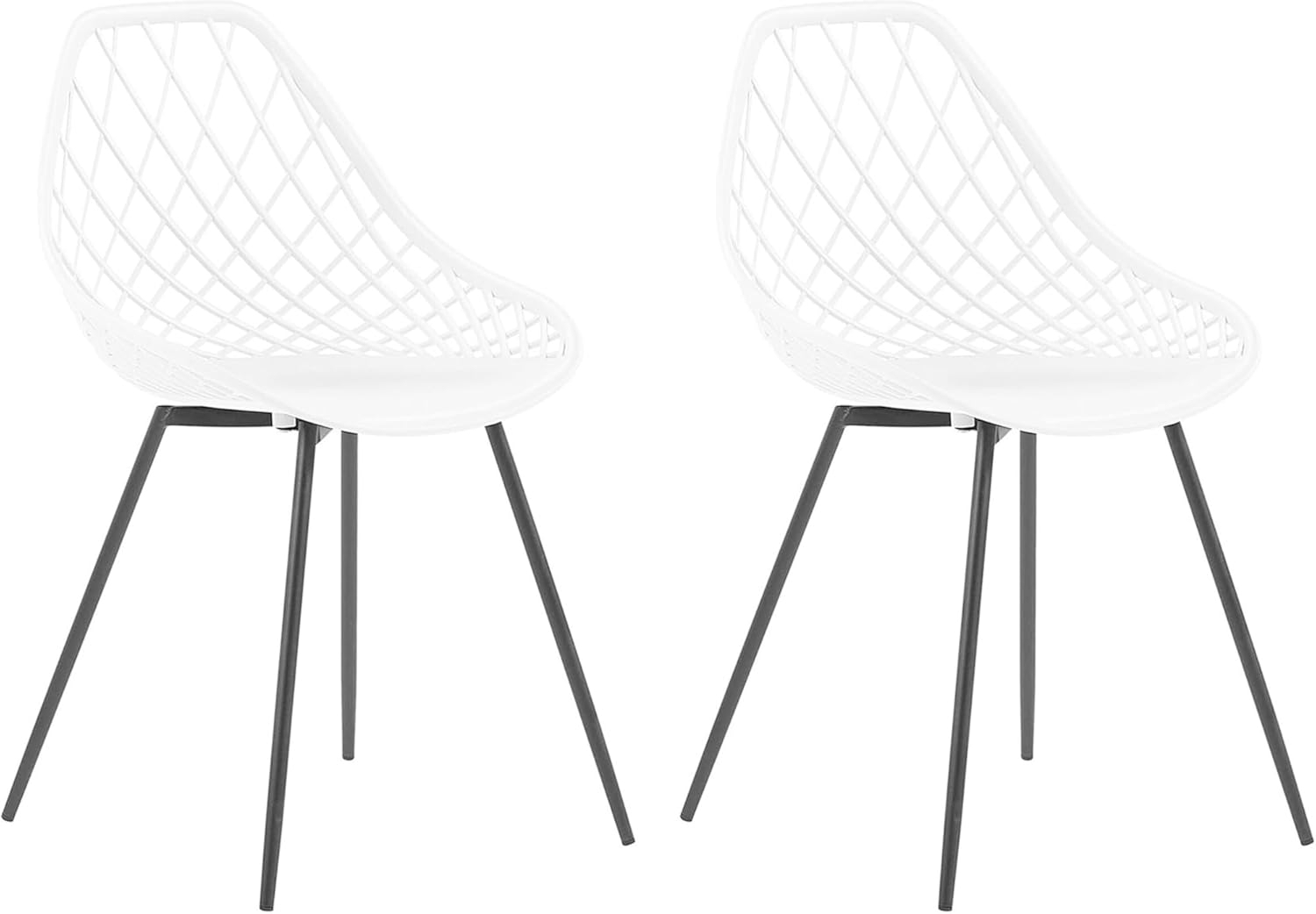 Extravaganter Esszimmerstuhl im 2er Set CANTON in Weiß. Gefertigt aus hochwertigem, strapazierfähigem Kunststoff und ausgestattet mit grazil anwirkenden Metallbeinen in Schwarz mit Pulverbeschichtung. Die feste und komfortable Sitzfläche sorgt für eine bequeme Passform und gute Standfestigkeit. Ideal für Ihr Esszimmer oder andere Räume. **Highlights** - Feste und komfortable Sitzfläche - Passt zu jedem Einrichtungsstil - Besonders pflegeleicht und langlebig - Schutzkappen zum Bodenschutz - Max. Belastung: 150 kg **Produkteigenschaften** - Typ: Esszimmerstuhl - Stil: Modern - Farbe: Weiß - Gestellfarbe: Schwarz - Material: Kunststoff und Metall - Sitzmaterial: Kunststoff - Finish: Matt - Maße: 86 cm Höhe, 46 cm Breite, 52 cm Tiefe, 47 cm Sitzhöhe, Sitzfläche 42 x 35 cm - Gewicht: 4 kg **Lieferumfang** - 2 x Stühle - Beine/Füße nicht montiert