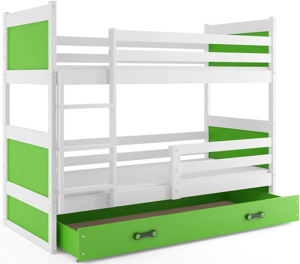 Etagenbett RICO 190x90 cm aus Kiefernholz, die farbigen Platten und Schublade aus MDF. Mit Lattenroste und Schaumstoffmatratzen mit Höhe von 7cm. Maβangaben: Breite 97cm, Höhe 154cm, Länge 196cm, Liegefläche: 2 x 190 x 90 cm. Das Bett mit dem Lattenrost und mit 2x Schaumstoffmatratzen 190x90 cm mit Höhe von 7cm. Belastbarkeit 70kg.