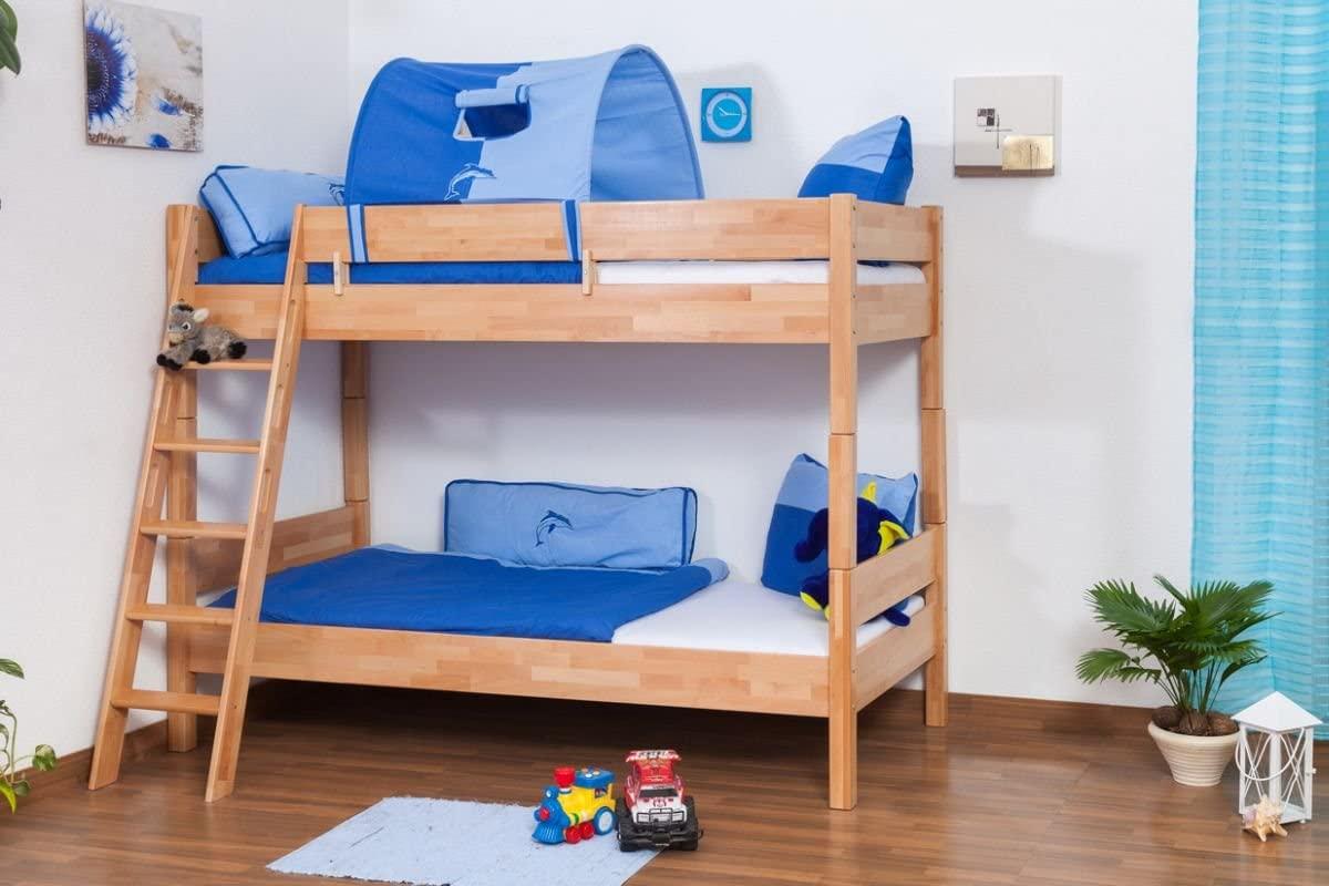Das Etagenbett 'Martin' von Steiner lädt mit seinen zwei Liegeflächen zum Träumen und Erholen ein. Das klare Design sorgt dafür, dass sich das Bett in jede vorhandene Einrichtung integrieren lässt. **Besonderheiten** - In zwei Einzelbetten umbaubar und so bis ins Jugendalter nutzbar - Hoher Rundum-Absturzschutz - Schräge Leiter, beidseitig montierbar - Leiter mit abgerundeten und breiten Trittstufen - Die Tiefe mit Leiter beträgt 140 cm - Extra starke 6x6 cm Pfosten **Qualität** - Stabile und sichere Bauweise aus Buche Massivholz - Hergestellt nach EU-Standard Etagenbetten sind für Kinder ab 6 Jahren geeignet, die eigenständig sitzen, stehen und die Leiter allein hinauf und hinab klettern können. Aufgrund der Höhe des Etagenbettes, empfehlen wir zur Sicherheit eine Befestigung an der Wand.