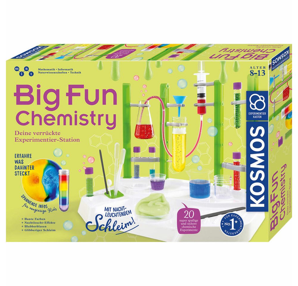- Entdecken Sie mit dem Kosmos Experimentierkasten Big Fun Chemistry die faszinierende Welt der Chemie! In 20 unterhaltsamen Experimenten können Kinder im Alter von 8 bis 13 Jahren glibbrigen Schleim herstellen, Flüssigkeiten zum Blubbern bringen und Farben verändern