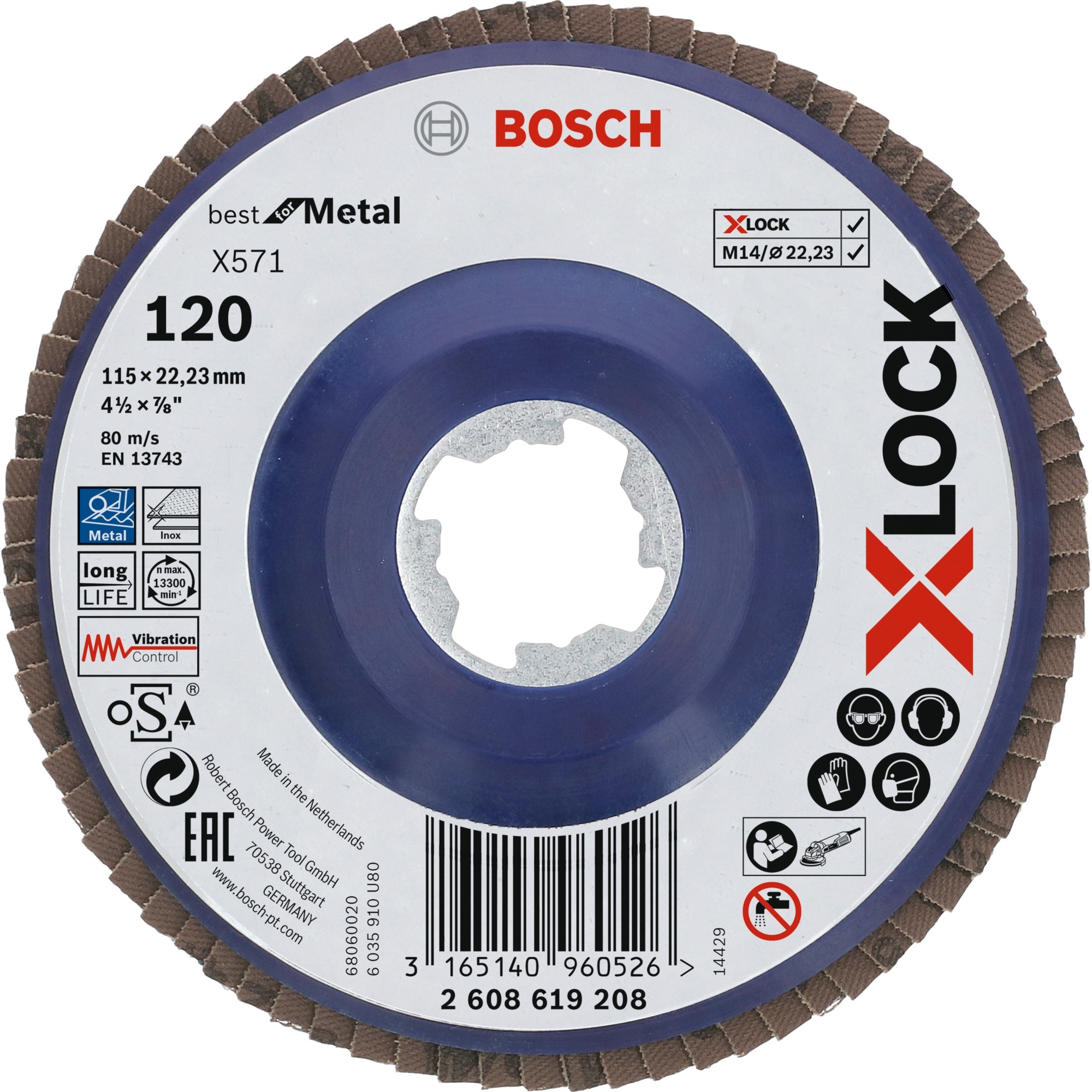 Bosch Professional gerade Fächerschleifscheibe Best (für Metall, X-LOCK, X571, Ø115 mm, Körnung K120, BohrungsØ 22,23mm)