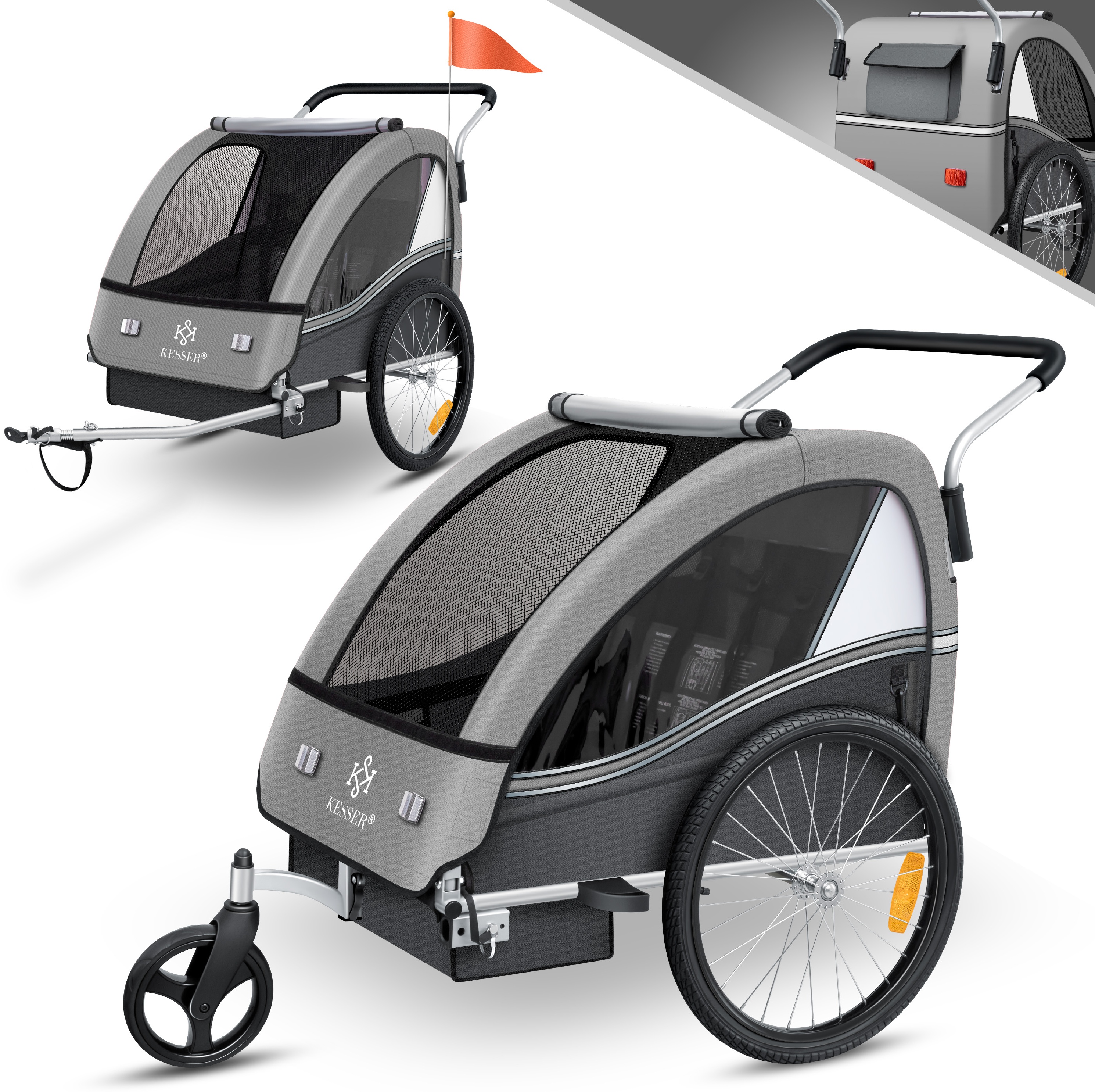 KESSER® 'Sport-RX' Kinderanhänger 2in1 in Hellgrau Joggerfunktion + 5-Punkt SicherheitsgurtAnhänger für 1 bis 2 Kinder, max. 40kg