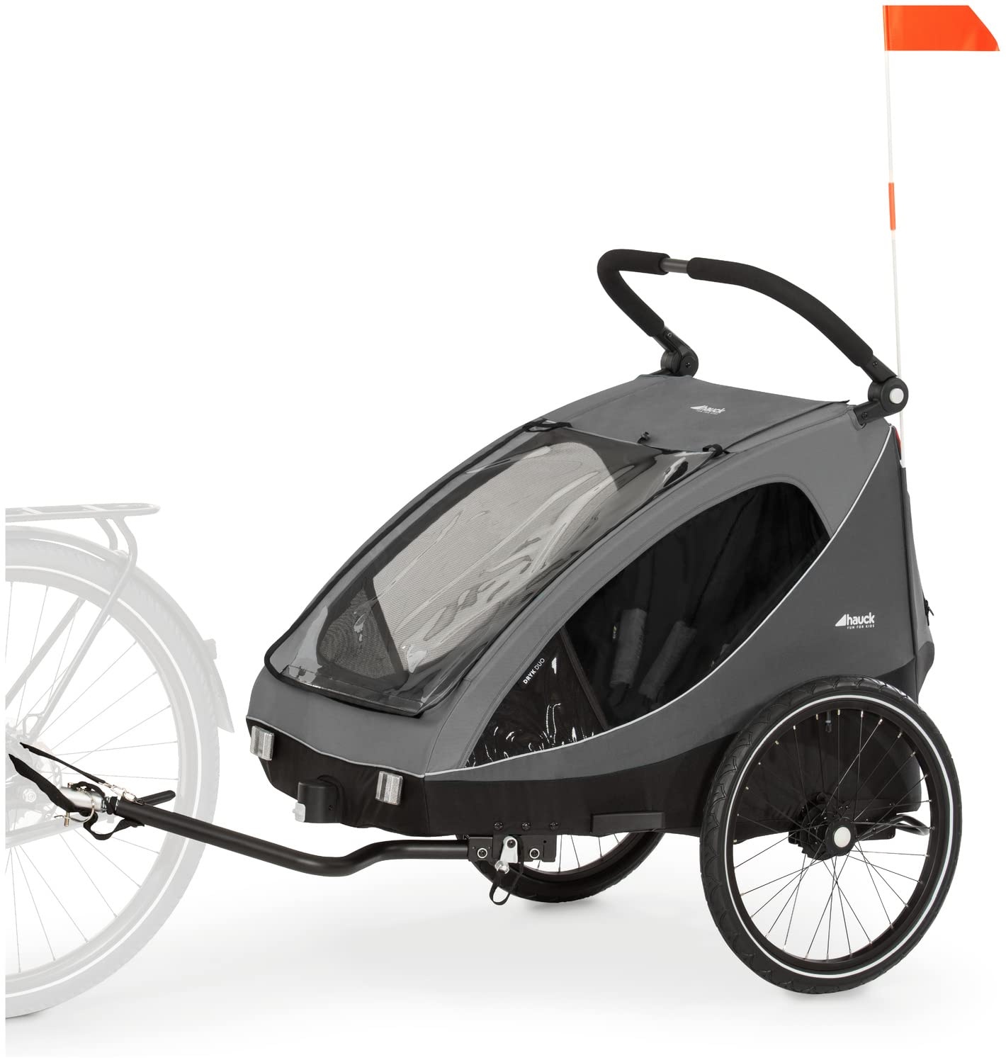 | Name | Hauck Fahrrad Anhänger 2 Kinder Dryk Duo inkl. Deichsel, Buggyrad und Fahne, Klappbar, Groß, XL Stauraum, Einfache Befestigung am Fahrrad, Nutzung als Buggy, Grau |