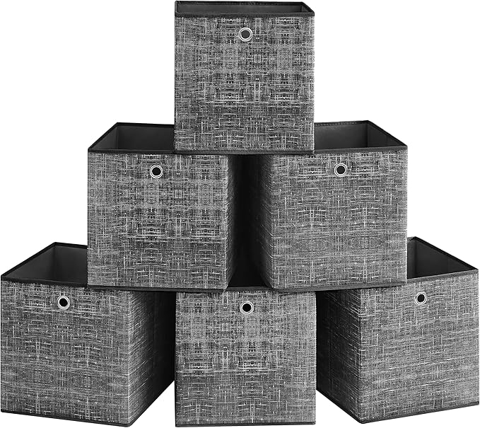 \[Robust und stabil\] Bewahren Sie Ihre Gegenstände mit diesen 6 Aufbewahrungsboxen ordentlich auf. Jede Box ist mit bis zu 5 kg belastbar und hat eine stabile Konstruktion aus 80 g/m² Vliesstoff und Karton \[Auffälliger Textur-Effekt\] Der Stoffbezug der Ordnungsboxen ist **schwarz meliert** und besticht durch einen dekorativen Textur-Effekt, damit die Boxen stilvoll aussehen und sich leicht in jedes Zimmer einfügen \[Einfach aufzustellen und zu verstauen\] Legen Sie die Bodenplatten hinein und schon sind die Körbe einsatzbereit. Sie passen in den Schrank, um verschiedene Gegenstände aufzubewahren. Bei Nichtgebrauch lassen sie sich zusammenklappen, um Platz zu sparen \[Ideal für das Würfelregal\] Die **33 x 33 x 33 cm**großen Aufbewahrungskörbe eignen sich **ideal für IKEA Würfelregale oder Würfelregale mit 34 x 34 x 34 cm**oder größeren Fächern. Dank der Grifföffnung lassen sie sich einfach herausziehe \[Vielseitig – für verschiedene Räumlichkeiten\] Nutzen Sie diese 6 Organizer aus Stoff im Schlafzimmer, um Kleidung zu verstauen, im Wohnzimmer, um Kleinigkeiten unterzubringen oder im Arbeitszimmer, um Bücher aufzubewahren Nutzen Sie dieses Set nach Ihrem Bedarf: Diese Stoffboxen sind vielseitig einsetzbar – im Kleiderschrank, auf dem Bücherregal, unter der Couchtischoberfläche oder auf dem Schreibtisch. Sie können sie separat oder zusammen nutzen – die Entscheidung liegt bei Ihnen. Die Highlights dieser Faltboxen im Überblick: - Dank der hochwertigen Materialien sind diese Aufbewahrungsboxen formstabil und tragen jeweils bis zu 5 kg. - Jede Box ist **33 x 33 x 33 cm**groß und passt perfekt in ein Würfelregal mit **34 x 34 x 34 cm** großen oder größeren Fächern. - Die Körbe lassen sich bei Nichtgebrauch flach zusammenklappen und platzsparend verstauen. - Dank der Grifföffnung lässt sich der Korb einfach aus dem Regal herausziehen. - Die Schlaufe an der Bodenplatte erleichtert es Ihnen, die Aufbewahrungskörbe aufzustellen oder zusammenzuklappen. - Ordentlich verarbeitete Nähte verleihen den Organizern eine hohe Qualität. - Stoffboxen sind atmungsaktiver als Kunststoffboxen und ideal zur Aufbewahrung von Kleidung. Produktdetails: - Farbe: **Schwarz meliert** - Material: Karton, 80 g/m² Vliesstoff - Größe pro Box: **33 x 33 x 33 cm** (L x B x H) - Gewicht insgesamt:**3,6 kg** - Max. statische Belastbarkeit pro Box: 5 kg Lieferumfang: - 6 x Aufbewahrungsbox SONGMICS Hinweise: - Wischen Sie die Oberfläche für die tägliche Reinigung mit einem leicht feuchten Tuch ab und lassen Sie die Stoffboxen an der Luft trocknen; bitte NICHT mit Wasser waschen. - Es könnte sein, dass die Boxen beim Auspacken einen leichten Geruch aufweisen. Platzieren Sie sie in diesem Fall bitte für einige Stunden an einem gut belüfteten Ort.