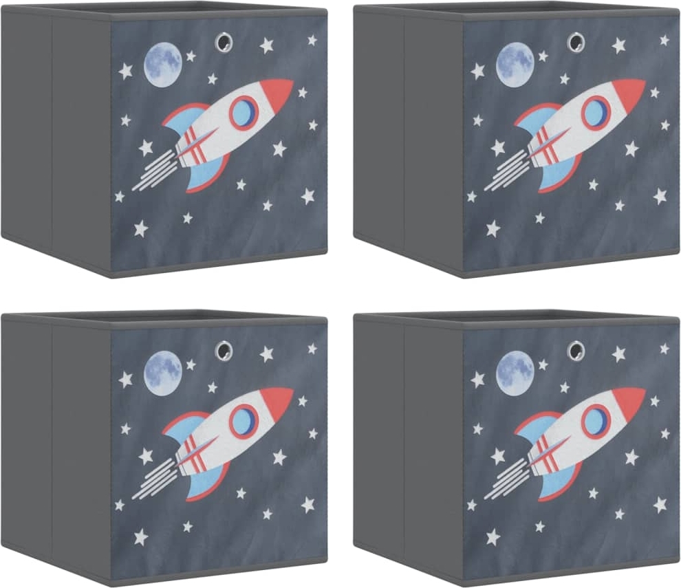 Faltboxen im praktischen 4er-Set in Grau sind die idealen Ordnungshelfer für Ihr Zuhause, WGs, Bastelräume oder Kinderzimmer. Hergestellt aus strapazierfähigem Vliesstoff, bieten sie eine lange Nutzungsdauer. Das platzsparende, faltbare Design ermöglicht eine einfache Lagerung, während die robusten runden Ösen einen mühelosen Zugriff auf Ihre verstauten Dinge gewährleisten. Diese vielseitigen Aufbewahrungsboxen sind perfekt zum Organisieren von Kleidung, Spielzeug und Büchern. **Highlights** - Strapazierfähiger Vliesstoff für lange Haltbarkeit - Faltbares Design für platzsparende Lagerung - Robuste runde Ösen für einfachen Zugriff - Vielseitige Aufbewahrungslösung für verschiedene Gegenstände - Pflegeleichtes Material für den täglichen Gebrauch **Produkteigenschaften** - Farbe: Grau mit Raketen-Aufdruck - Material: Vlies - Abmessungen: 32 x 32 x 32 cm (L x B x H) - Mit runden Ösen - Zusammenklappbar **Lieferumfang** - 4 x Aufbewahrungsbox