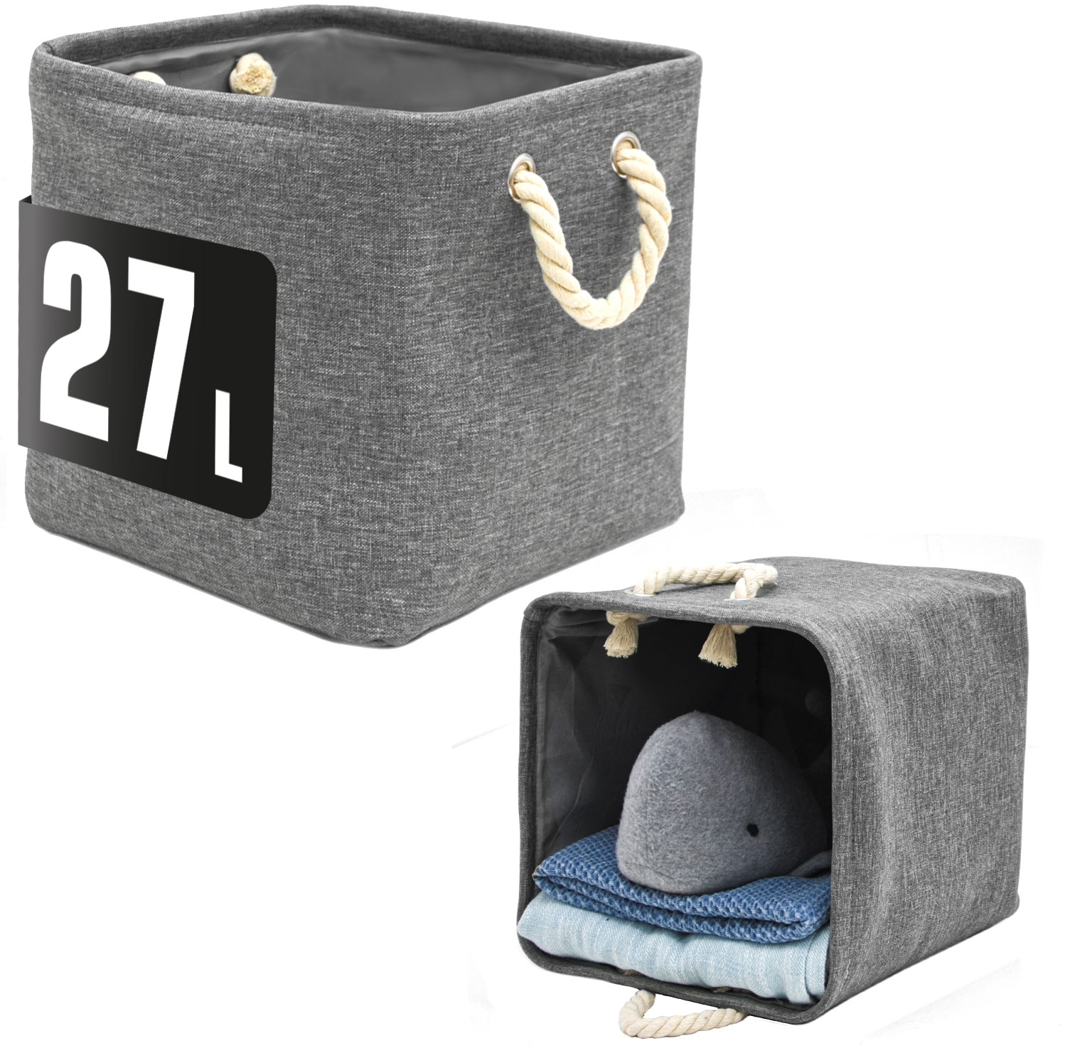 Praktisches 2er Set Aufbewahrungsboxen im eleganten Leinen Look, ideal für das IKEA Kallax Regal. Mit den Maßen von ca. 30 x 30 x 30 cm und einem Volumen von ca. 27 Litern bieten diese faltbaren Körbe ausreichend Stauraum. Geflochtene Seilgriffe aus 100 % Baumwolle und stabile Metallösen sorgen für einen reißfesten Halt. Der hochwertige graue Canvas-Bezug ist robust, pflegeleicht und mit einer ca. 1 mm dicken Stützschicht aus EVA-Schaumstoff ausgestattet. **Highlights** - Kompatibel mit IKEA Kallax Regal - Geflochtene Seilgriffe für einfachen Transport - Robustes und pflegeleichtes Material - Faltbar und formstabil - Schadstoffgeprüfte Qualität **Produkteigenschaften** - Maße (HxBxT): 30 x 30 x 30 cm - Volumen: ca. 27 Liter - Material: 100 % Polyester - Handwäsche bei 30 °C - Stützschicht: ca. 1 mm EVA-Schaumstoff - Futterstoff in Satin Optik - Klimaneutraler Versand seit 2012 **Lieferumfang** - 2 Aufbewahrungsboxen - Falten können mit Dampfbügeleisen geglättet werden