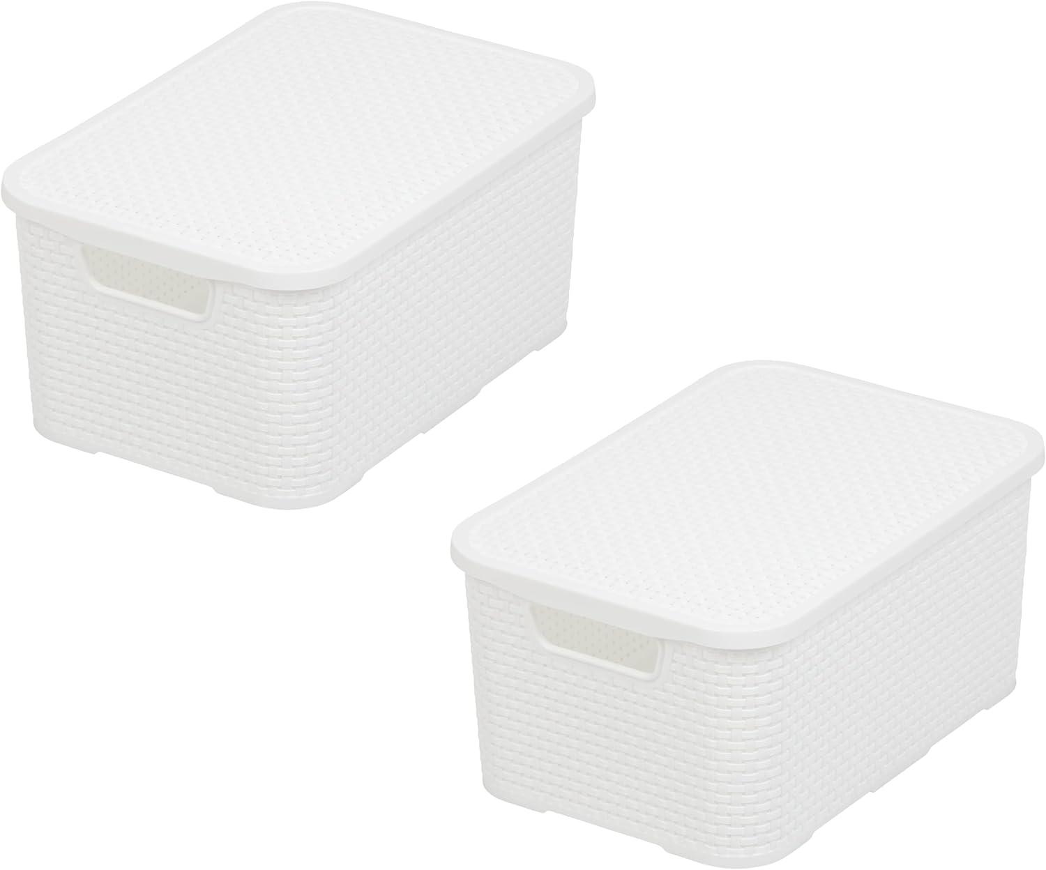 in FaltboxenBranQ - Home essential Korb mit Deckel in Rattan Design 2er Set Grösse M 10 lBPA-frei Kunststoff PP, Weiß, 28,8 x 19,7 x 16,2 cm, 2 Stk.
