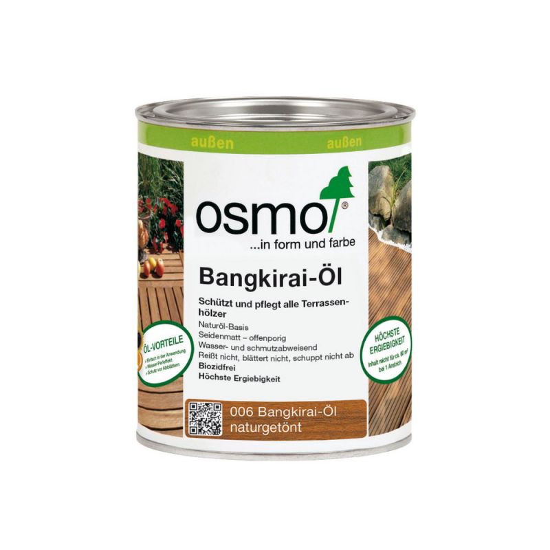 - Osmo Bangkirai-Öl ist ein transparenter, seidenmatter Holzanstrich auf Naturölbasis, der für verschiedene Holzarten im Außenbereich geeignet ist.