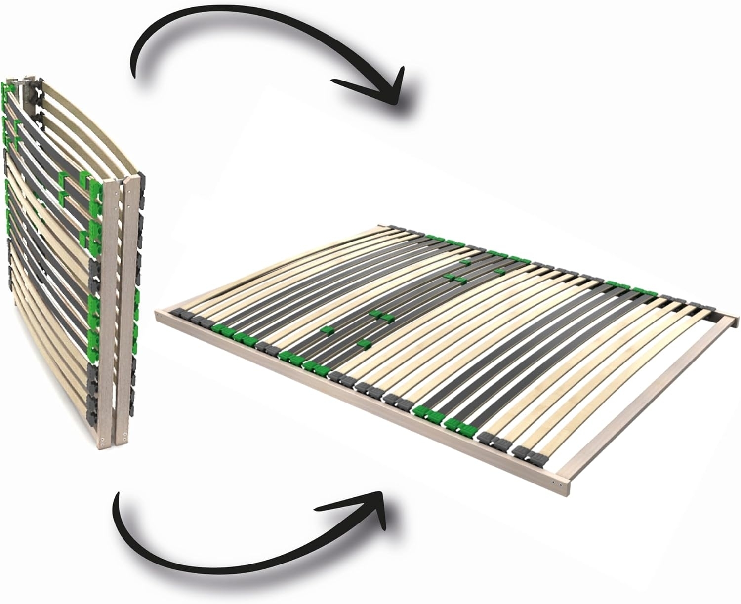 - Er verfügt über 28 flexible Federleisten, die in elastischen Kautschuk-Kappen gelagert sind, was eine punktgenaue Lagerung der Matratze ermöglicht.