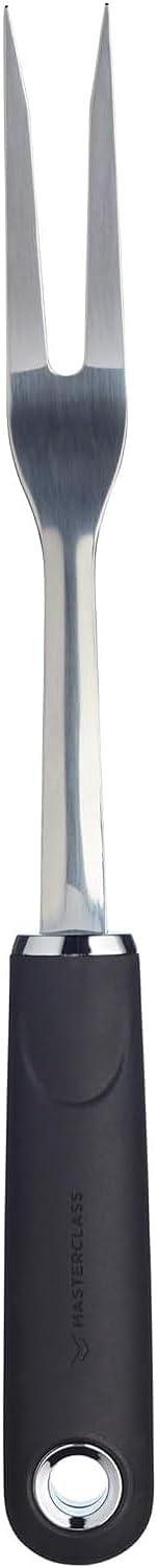 Die Fleischgabel aus Nylon und Edelstahl in Schwarz-Silber mit einer Länge von 32 cm ist ein hochwertiges Küchenwerkzeug, das Ihnen beim Tranchieren maximale Kontrolle und Sicherheit bietet. Der "Soft Touch" Griff mit Daumenauflage sorgt für einen angenehmen Halt, während die starken Zinken aus rostfreiem Edelstahl mühelos durch jeden Braten gleiten. Diese langlebige Tranchiergabel ist Teil der MasterClass Collection und wird Ihnen viele Jahre treue Dienste leisten. **Highlights** - Hochwertiger "Soft Touch" Griff mit Daumenauflage für maximale Kontrolle und Sicherheit beim Tranchieren - Starke Zinken aus Edelstahl durchdringen mühelos jeden Braten - Langlebig dank robustem "Soft Touch" Handgriff aus schwarzem Kunststoff und strapazierfähigen rostfreien Zinken - Teil der MasterClass Collection mit hochwertigen Profi-Produkten für den Küchenalltag - Spülmaschinenfest und mit einer Garantie von 5 Jahren **Produkteigenschaften** - Abmessungen: 32 cm - Material: Nylon-RVS (Nylon und Edelstahl) - Farbe: Schwarz-Silber - Robuste Zinken aus Edelstahl - Langlebiges Design mit strapazierfähigem "Soft Touch" Handgriff aus schwarzem Kunststoff