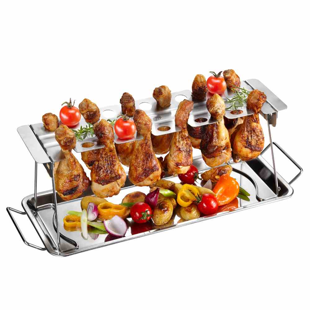 - Bis zu 12 pikant gewürzte Hähnchenkeulen oder -flügel können ohne Wenden auf dem Grill zubereitet werden.