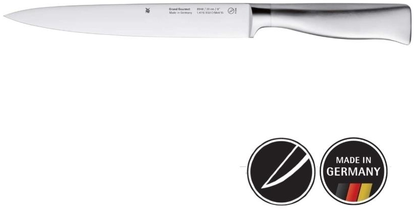 - Das WMF Grand Gourmet Fleischmesser hat eine 20 cm lange, leicht gebogene Klinge, die das Schneiden und Tranchieren von großen Braten erleichtert.