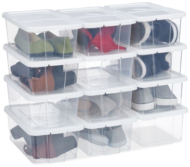 | Beschreibung | Mit dem 48er Set Schuhboxen aus Kunststoff bringen Sie Ordnung in Ihr Schuhchaos. Die transparenten Boxen ermöglichen eine übersichtliche und platzsparende Aufbewahrung von Sneakern, Ballerinas, Sandalen und mehr. Dank des transparenten Designs haben Sie Ihr Schuhwerk schnell im Blick. Die Boxen lassen sich stapeln und sind vielseitig einsetzbar, auch für andere Aufbewahrungszwecke. **Highlights** - 48er Set für optimale Schuhorganisation - Transparentes Design für schnelle Erkennbarkeit der Schuhe - Platzsparend stapelbar für effiziente Nutzung - Mit 6 kleinen Belüftungslöchern im Deckel - Vielseitig einsetzbar für Spielzeug und Bastelutensilien **Produkteigenschaften** - Außenmaße H x B x T: ca. 12,5 x 20 x 34,5 cm - Innenmaße H x B x T: ca. 11,5 x 17,5 x 32 cm - Bodenmaße B x T: ca. 16x29,5 cm - Gewicht pro Box: ca. 240 g - Material: PP - Farbe: Transparent, weiß **Lieferumfang** - 48x Ordnungsbox mit Deckel - Dekorartikel sind im Lieferumfang nicht enthalten |