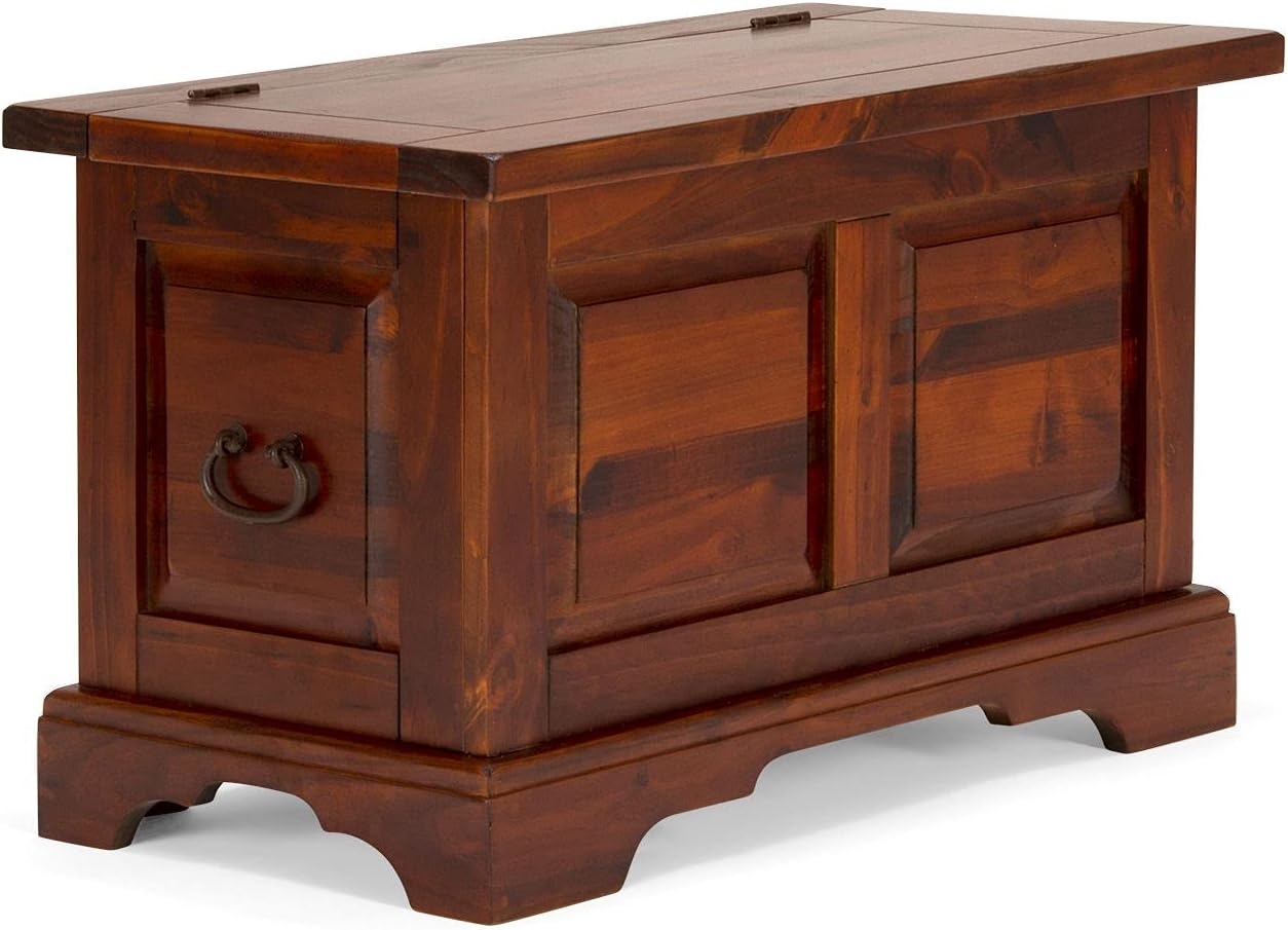 Die Truhe Catana in Braun vereint Funktionalität und stilvolles Design. Hergestellt aus hochwertigem Pinienholz im rustikalen Kolonialstil, bietet sie nicht nur einen großen Stauraum, sondern kann auch als Ablage oder Couchtisch genutzt werden. Die lackierte Oberfläche schützt das Holz und sorgt für Langlebigkeit. Ein praktischer Mechanismus im Inneren verhindert das vollständige Aufklappen des Deckels und sichert ihn im geöffneten Zustand. **Highlights** - Hergestellt aus hochwertigem Pinienholz - Rustikale Oberfläche im Kolonialstil - Vielseitig einsetzbar als Truhe, Ablage oder Couchtisch - Lackierte Oberfläche zum Schutz des Holzes - Mechanismus zur Arretierung des Deckels im geöffneten Zustand **Produkteigenschaften** - Maße (BxHxT): 80 x 50 x 44 cm - Großer Stauraum im Inneren der Kiste - Mechanismus zur Verhinderung des kompletten Aufklappens der Truhe