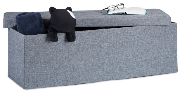Die faltbare Sitzbank von Relaxdays aus dunkelgrauem Leinen bietet mit einem Fassungsvermögen von ca. 140 L viel Stauraum. Sie ist stabil und belastbar bis 300 kg. Das weiche Polster sorgt für ein angenehmes Sitzgefühl. Bei Nichtgebrauch kann die Sitzbank platzsparend zusammengefaltet werden. **Highlights** - Viel Stauraum: Mit ca. 140 L Fassungsvermögen bietet die Sitzbank ausreichend Platz für verschiedene Gegenstände. - Robust und stabil: Die Sitzbank ist dank der zusätzlichen MDF Platte stabil verbaut und belastbar bis 300 kg. - Bequemes Sitzgefühl: Das weiche Polster sorgt auch bei längerem Sitzen für Komfort. - Platzsparend: Die Sitzbank kann bei Nichtgebrauch einfach zusammengefaltet und verstaut werden. - Vielseitig einsetzbar: Passt in jedes Zimmer und fügt sich dank des schlichten Designs in jede Einrichtung ein. **Produkteigenschaften** - Material: Leinen - Farbe: Dunkelgrau - Maße aufgebaut: 38 x 114 x 38 cm - Maße zusammengefaltet: 6 x 114 x 38 cm - Belastbarkeit: bis 300 kg - Fassungsvermögen: ca. 140 L - Gewicht: ca. 9 kg **Lieferumfang** - Sitzbank gefaltet - Extra Deckel - Bodenplatte - Trennwand - Dekorationsartikel sind im Lieferumfang nicht enthalten