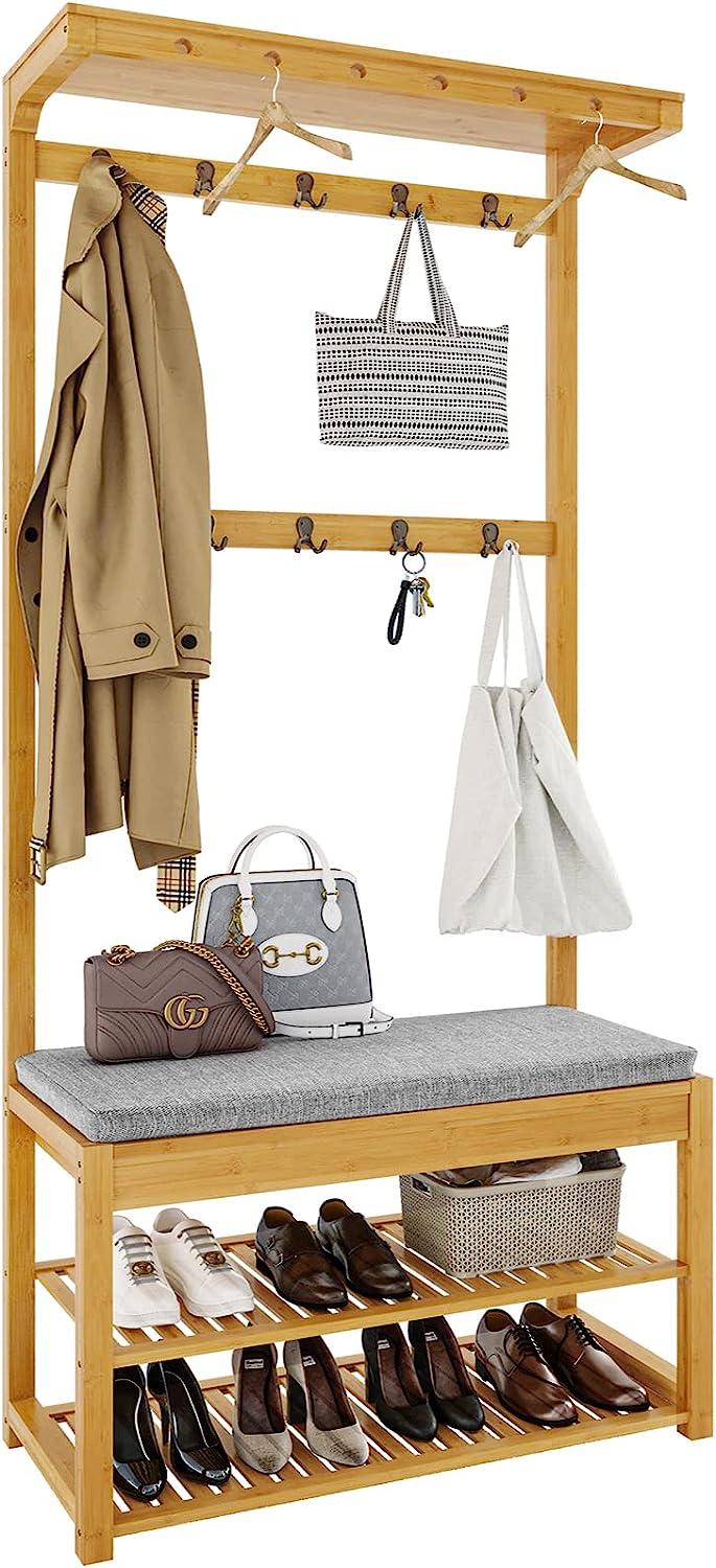 | Name | VIAGDO Garderobenständer mit Sitzbank, Kleiderständer mit 10 Haken und Schuhregal, Stauraum unter der Sitzfläche, Flurregal, im Flur, Wohnzimmer, Büro, Schlafzimmer, aus Bambus, Höhe 175 cm |