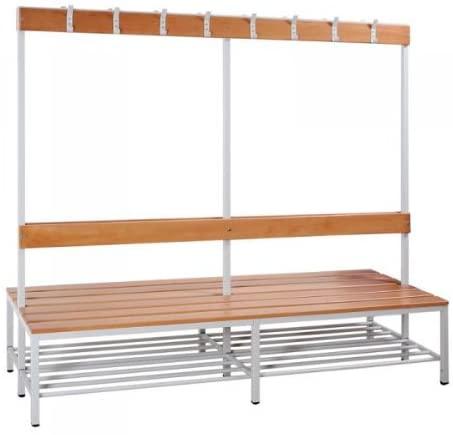 Die Sitzbankgarderobe in doppelseitiger Ausführung bietet mit ihrem robusten 30 mm-Quadratrohr Gestell aus pulverbeschichtetem Stahl und hochwertigen Buchenholz-Sitzbankauflagen eine ideale Lösung für Umkleideräume in verschiedenen Branchen. Mit Haken für Jacken, einem Schuhrost und bis zu 10 mm höhenverstellbaren Bodengleitern. **Highlights** - Robustes 30 mm-Quadratrohr-Gestell - Hochwertige Buchenholz-Sitzbankauflagen - Bis zu 10 mm höhenverstellbare Bodengleiter - Doppelseitige Ausführung - Elektrostatisch pulverbeschichtetes Stahlgestell **Produkteigenschaften** - Langlebige, pflegeleichte Stahl-Konstruktion - Stabiles Gestell mit Schuhrost - 12 Haken, 9 Füße - Sitzhöhe: 400 mm, Gesamthöhe: 1825 mm - Breite: 1600 mm, Tiefe: 400 mm **Lieferumfang** Teilmontiert im Karton: Sitzbankgarderobe in RAL 7035 Lichtgrau/Buche 806120.