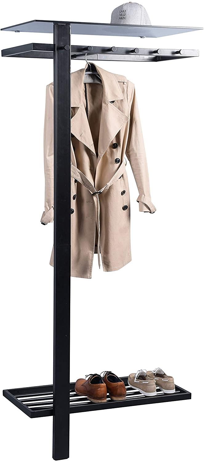 Die Garderobe Bonn ist eine zeitgemäße Lösung für Ihren Eingangsbereich, die Eleganz und Funktionalität vereint. Das Gestell wurde aus schwarzem Metall gefertigt, was dem Möbelstück ein modernes und schlichtes Erscheinungsbild verleiht. Mit großzügigen Abmessungen von ca. 80 x 190 x 43 cm bietet es zudem ausreichend Platz, um Ihre Kleidung und Accessoires ordentlich unterzubringen. Es erwarten Sie sechs robuste Haken, an denen Sie Jacken, Mäntel und Schals aufhängen können. Darüber hinaus gibt es eine zusätzliche Ablage für die Aufbewahrung von Taschen oder Schuhen. Die Hutablage aus grauem Sicherheitsglas verleiht der Garderobe Bonn einen Hauch von Raffinesse und sorgt gleichzeitig für zusätzlichen Stauraum.