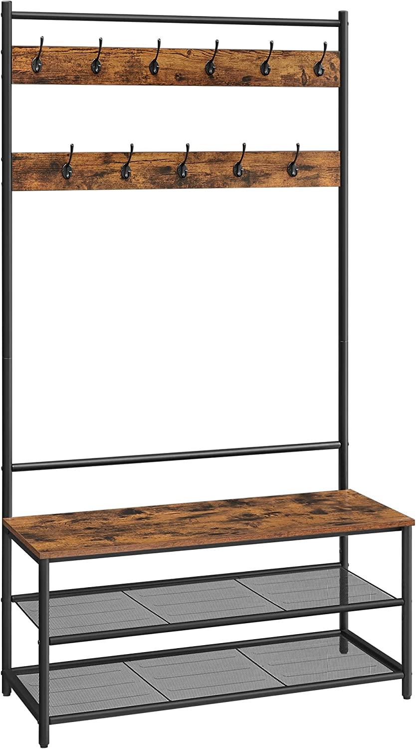 HSR410B01 Garderobe mit 11 Haken Schuhregal für kleine Wohnung Schlafzimmer Flur Industriedesign Vintage Braun Schwarz