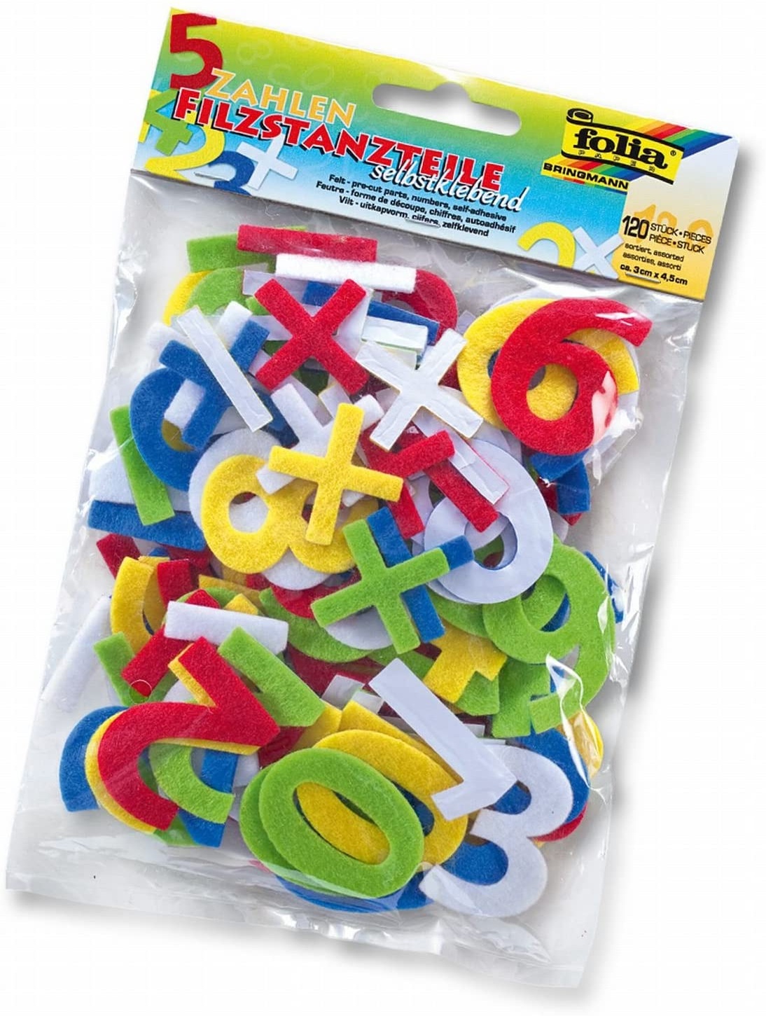 Stanzteile aus Filz, selbstklebend Formen: Zahlen Sortiert in 5 verschiedenen Farben Inhalt: ca. 120 Teile Je ca. 4,5 cm groß, Hersteller: folia