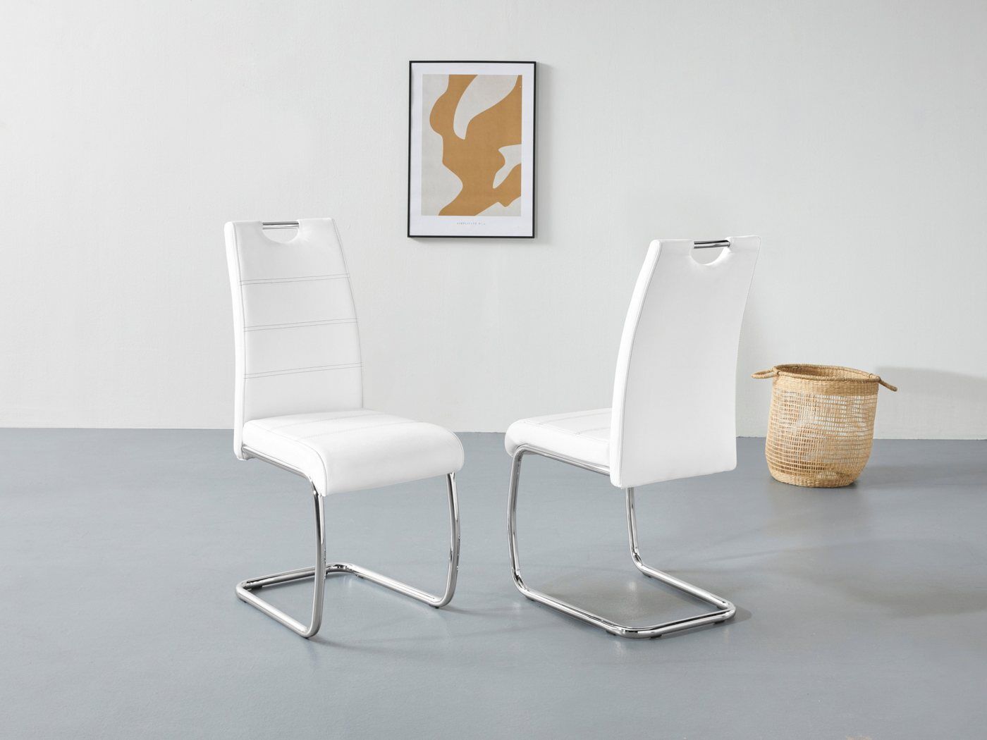 Der Schwingstuhl Flora ist ein Highlight für jeden Essbereich. Mit seinem abgerundeten Rundrohrmetallgestell, der gebogenen Rückenlehne und dem pflegeleichten Kunstlederbezug mit Doppelnähten bietet er nicht nur weiche Formen, sondern auch eine stilvolle Optik. Der Stuhl ist ca. 42 cm breit, 57 cm tief und 98 cm hoch. Die Sitzhöhe beträgt ca. 46 cm und die Sitztiefe ca. 44 cm. Das verchromte Metallgestell sorgt für Stabilität und Langlebigkeit. Der Kunstlederbezug besteht aus 97% Polyurethan und 3% Baumwolle. Der Schwingstuhl Flora ist belastbar bis zu 120 kg. Im Lieferumfang enthalten sind 2 Stühle in der Farbe Weiß. Bitte beachten Sie, dass der Artikel zerlegt geliefert wird, aber mit der beiliegenden Aufbauanleitung einfach zu montieren ist. Dekorationsartikel, Beleuchtungen und Hi-Fi-Geräte sind nicht im Lieferumfang enthalten. **Highlights** - Abgerundetes Rundrohrmetallgestell für weiche Formen - Gebogene Rückenlehne für zusätzlichen Komfort - Pflegeleichter Kunstlederbezug mit Doppelnähten - Stilvolle Optik für jeden Essbereich - Belastbar bis zu 120 kg **Produkteigenschaften** - Abmessungen: ca. B 42 x T 57 x H 98 cm - Sitzhöhe: ca. 46 cm - Sitztiefe: ca. 44 cm - Material: Kunstleder (97% Polyurethan, 3% Baumwolle) - Verchromtes Rundrohrmetallgestell - Integriertes Griffloch für einfaches Tragen **Lieferumfang** - 2er Set Schwingstuhl Flora in Weiß