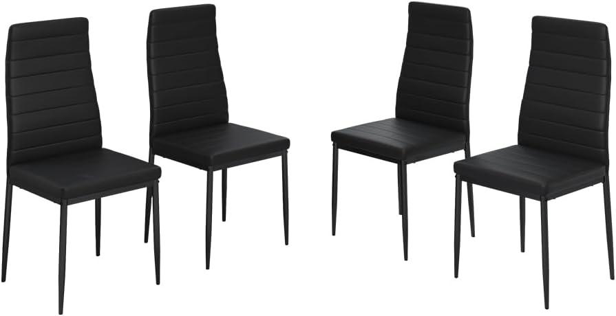 Dieses 4er-Set bietet Ihnen die perfekte Lösung für Ihre Sitzbedürfnisse. Dank der hohen Rückenlehne genießen Sie unvergleichlichen Sitzkomfort. Die bequeme Polsterung verspricht ein Sitzerlebnis der Extraklasse. Das moderne Design verleiht Ihrem Raum einen Hauch von Eleganz und Stil. --- **Technische Details:** **Farbe:** Schwarz **Maße:** Gesamt: 42,5 x 96 x 48 cm (BxHxT) Stuhlbeine: Ø 25 mm Sitzhöhe: 47,5cm Sitzbreite: 40,5 cm Sitztiefe: 39,5 cm Polsterhöhe: 5 cm **Material:** Sitz- & Rückenfläche: Polyurethan Stuhlbeine: Metall, pulverbeschichtet **Artikelgewicht:** 14.41 kg **Artikelgewicht inkl. Verpackung:** 15.4 kg --- LIEFERUMFANG: Esszimmerstuhl 4er Set, Montageanleitung, Montagematerial.