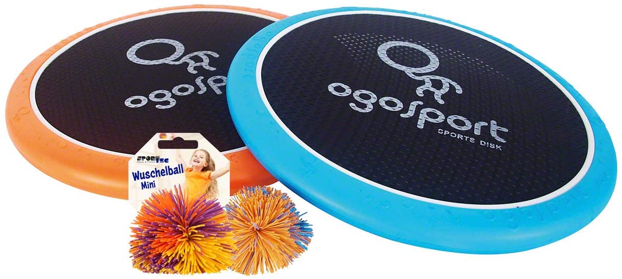 **Bei Ogosport sind der Kreativität keine Grenzen gesetzt!** Das Ogosport Set aus zwei Ogo Scheiben (Ø 29cm) mit Kunststoff-Rahmen und elastischer, robuster Netzbespannung sowie zwei Ogo-Bällen (Ø 6,5cm). Die Superdisk fängt Bälle und schießt sie bis zu 45 Meter weit, aber kann auch als Wurfdisk verwendet werden. Der spezielle Soft-Ball ist weich genug für drinnen, bietet unbegrenzte Spielmöglichkeiten und rollt nicht auf die Straße. Schult die Auge-Arm-Koordination von Kindern, ideal auch als Einzelbeschäftigung, im Sommer auch spielbar mit wassergefüllten Luftballons. **Weitere Informationen zum Ogo Sport Set XS:** - Inhalt: 2 Ogo Scheiben mit 2 Bällen - Durchmesser Scheibe: 29 cm - Durchmesser Bälle: 6,5 cm - Reichweite: bis zu 45 m - Altersempfehlung: ab 6 Jahren Warnhinweis: Nicht geeignet für Kinder unter 3 Jahren. Erstickungsgefahr durch abbrechbare, verschluckbare Kleinteile. Nicht mit scharfkantigen Gegenständen spielen. Nicht mit Gegenständen spielen, die schwerer als ein Tennisball sind.