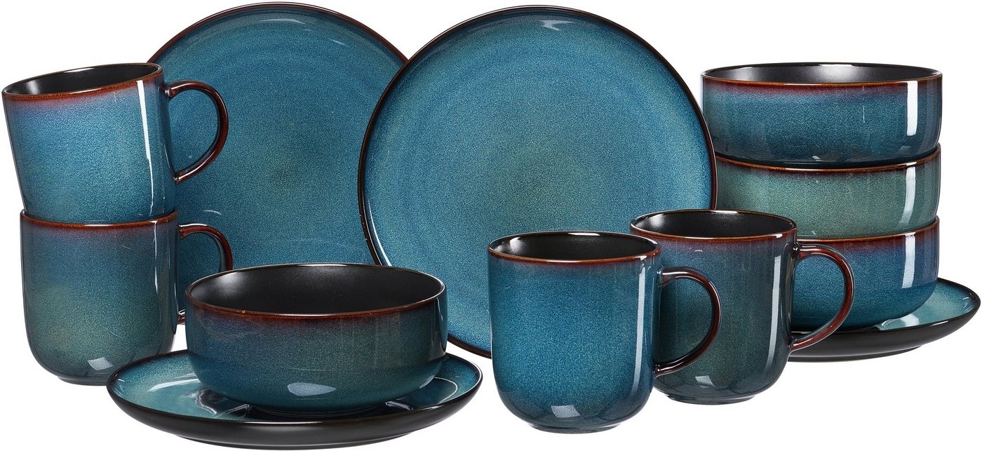 Das Frühstücksset Bali von Ritzenhoff & Breker ist ein trendiges Geschirrset mit einem entspannten handwerklichen Urban-Country-Charme. Jedes Geschirrteil hat einen individuellen Unikat-Charakter aufgrund der blauen Farbverläufe und Strukturen, die sich während des Brennvorgangs entwickeln. Die handgemalten Farbkanten bei Bechern und Schalen verleihen dem Geschirr zusätzlich einen besonderen Charme. Die seidenmatte schwarze Oberfläche bildet einen schönen Kontrast zu den glänzenden Farbflächen und verleiht dem Geschirr einen markanten Charakter. **Highlights** - Trendiges Geschirrset mit Urban-Country-Charme - Individueller Unikat-Charakter durch Reaktivglasur - Handgemalte Farbkanten bei Bechern und Schalen - Kontrastreiche Kombination aus seidenmattem Schwarz und glänzenden Farbflächen - Spülmaschinenfest und mikrowellengeeignet **Produkteigenschaften** - Bestehend aus 4 Kaffeebechern (400 ml, 10 cm hoch), 4 Schalen (600 ml, 14 cm Ø, 7 cm hoch) und 4 Frühstückstellern (20,5 cm Ø) - Reaktivglasur für individuelle Farbverläufe - Material: Steinzeug - Farbe: Blau - Für 4 Personen **Lieferumfang** - 4 Kaffeebecher (400 ml, 10 cm hoch) - 4 Schalen (600 ml, 14 cm Ø, 7 cm hoch) - 4 Frühstücksteller (20,5 cm Ø)