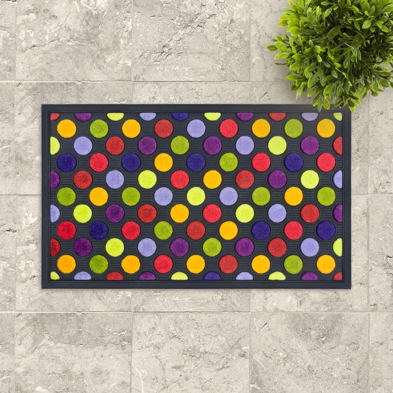 Die Lako 'Portacolor' Fußmatte bringt mit ihrem bunten Punktedesign Farbe in Ihr Zuhause. Mit den Abmessungen von 45 x 75 cm ist sie nicht nur ein Blickfang, sondern auch äußerst funktional. Hergestellt aus Polyamid und Gummi, bietet sie hohe Rutschfestigkeit durch den umlaufenden, abgeschrägten Rand. Ideal für Innen-, Eingangs- und geschützte Außenbereiche, nimmt sie sowohl feinen als auch groben Schmutz auf. **Highlights** - Auffälliges, buntes Punktedesign - Hohe Rutschfestigkeit durch abgeschrägten Rand - Geeignet für Innen-, Eingangs- und geschützte Außenbereiche - Nimmt feinen und groben Schmutz auf - Leicht zu reinigen durch Ausklopfen, Abbürsten, Absaugen oder Abspritzen **Produkteigenschaften** - Abmessungen: 45 x 75 cm - Material: Polyamid und Gummi - Umlaufender, abgeschrägter Rand für einfaches Betreten - Pflegehinweis: leicht zu reinigen