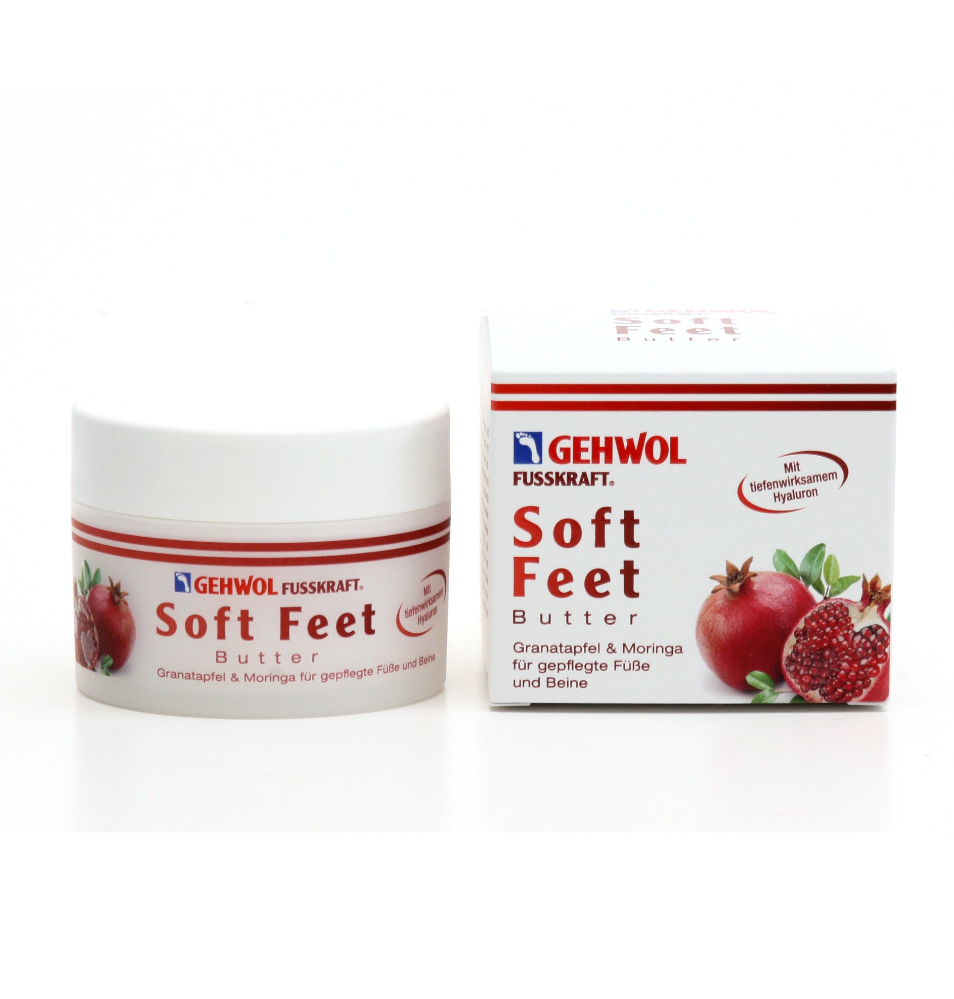 - Gehwohl Fußkraft Soft Feet Butter enthält Granatapfelextrakt und Moringaöl, die die Haut geschmeidig machen und intensiv pflegen.