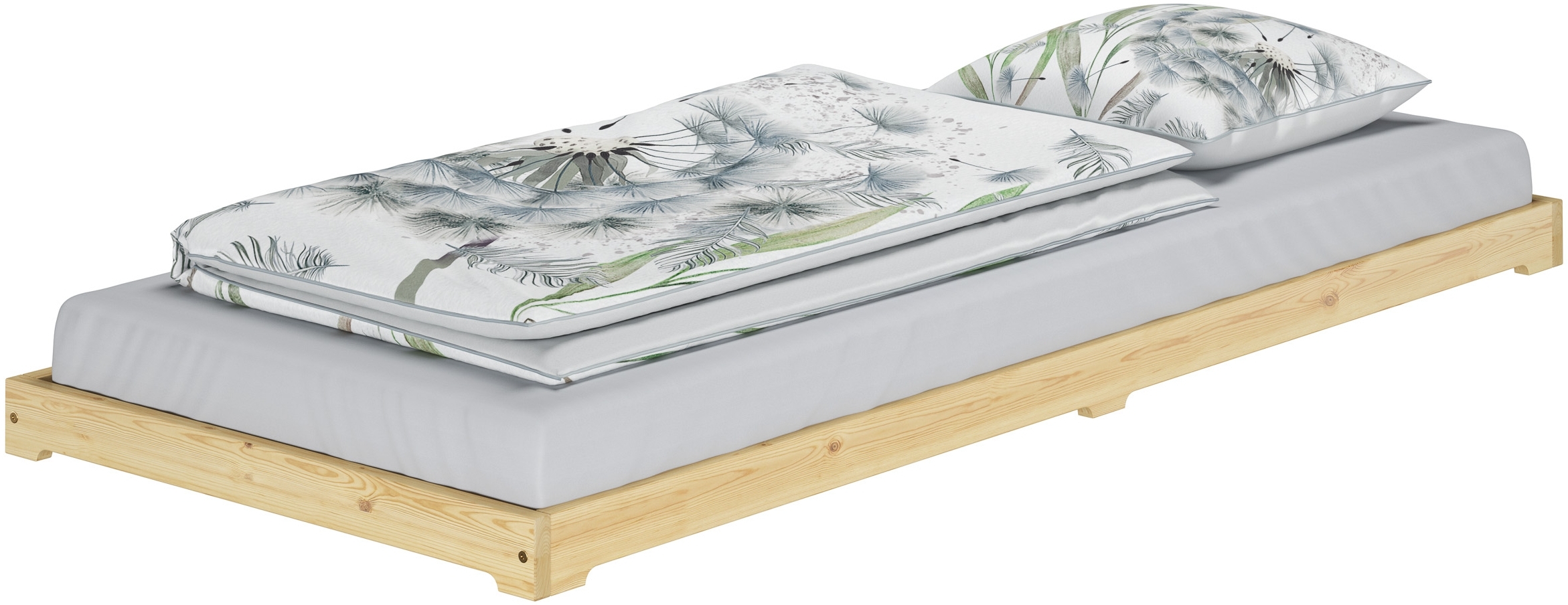 | Beschreibung | Kleines Unterschiebbett aus massivem Kiefernholz mit einer Liegefläche von 80 x 180 cm. Das extra niedrige Bett ist ideal für kleine Räume und lässt sich platzsparend verstauen. Der robuste Rahmen hat eine Rahmenhöhe von 9 cm und eine Seitenwandstärke von 2,4 cm. Es bietet eine Einlegetiefe von 5,5 cm für einen Rollrost. Geeignet für Personen bis 90 kg. **Highlights** - Perfektes Gästebett für jeden Raum - Kompakte Liegefläche von 80 x 180 cm - Robuster Rahmen aus massiver Kiefer - Platzsparendes Design für einfache Aufbewahrung - Optionale Matratze für hohen Schlafkomfort **Produkteigenschaften** - Außenmaß: ca. 85 x 185 cm - Rahmenhöhe: ca. 9 cm - Seitenwandstärke: ca. 2,4 cm - Einlegetiefe für Rollrost und Matratze: ca. 5,5 cm - Material: Massives Kiefernholz - Einfacher Aufbau mit Schraubensatz und Montageanleitung - Matratzenhöhe: ca. 15 cm, Kernhöhe: ca. 14 cm - Bezug: 100 % Polyester, waschbar bis 60 °C - Härtegrad: Mittel, geeignet für Personen bis 90 kg **Lieferumfang** - Bettgestell ohne Zubehör |