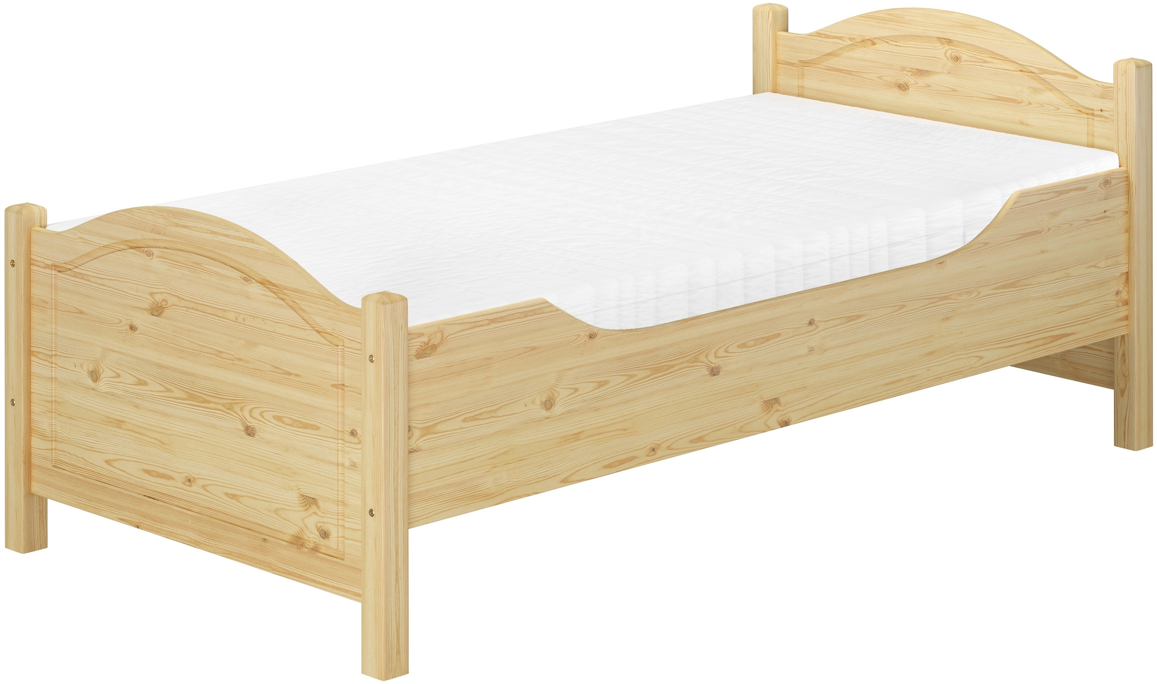 Stabiles Seniorenbett - extra hochfür leichtes Aufstehen mit Lattenrollrost aus Federleistenmit Matratze Komfortschaum (ohne Deko) Naturprodukt Holz. logisch! **Beschreibung:** Das Bett ist aus massiver europäischer Kiefer gefertigt. Das Holz stammt aus schonend bewirtschafteten Wäldern= nachhaltige Bewirtschaftung ohne Fremdstoffe Die sehr stabile Ausführung eignet sich auch toll als Gästebett z. B. für Hotels und Pensionen. Das Einzelbett ist solide verarbeitet, die Oberfläche fein geschliffen und natur lackiert. Das Holzbett lässt sich dank der Markenbeschläge und dessolide verarbeiteten Materials sehr leicht und zügig aufbauen. Die Einlegetiefe kann variabel montiert werden. Hierzu wird eine zusätzliche Auflageleistemit vorgebohrten Löchern mitgeliefert sowie Klötzchen als Abstandshalter in 6 cm und 12 cm Länge. **Maße:** **Liegefläche:** 100x200 cm **Außenmaß:** ca. 108 x 212 x 85 cm (B/L/H) **Höhe Kopfteil:** ca. 85 cm **Höhe Fußteil:** ca. 71 cm **Brettstärke Kopf und Fußteil:** 25 mm **Pfostenstärke:** ca. 60x60 mm **Seitenteil:** ca. 20x240/340 mm **Einlegetiefe variabel:** ca. 8 - 20 cm (Mitte) **Höhe Bettkante (Mitte):** ca. 49 cm **Bodenfreiheit:** ca. 24,5 cm Passende Bettkästen, Matratzen und Nachttische finden Sie im Shop! Dieses Bettenmodell ist auch für elektrische Motorrahmen geeignet. Rollroste aus Birkenfederleisten Liegefläche 100x200 cm. sehr stabile Federholzleisten 15 Stück Birkenfederleisten 63x8 mm. Hergestellt aus Birke. Die einzelnen Latten sind auf Gurtbänder geheftet. 3 Leisten sind gebohrt zur Fixierung ( Schrauben sind nicht im Lieferumfang ). Rollroste ab einer Breite von 120 cm müssen in der Mitte gestützt werden. Beschreibung **Matratze:** Hervorragende Körperanpassung für höchsten Schlafkomfort Ermöglicht natürliches Schlafverhalten durch minimales Nachschwingen Trockenes Schlafklima durch atmungsaktive Materialien Leicht abnehmbarer und bis 60° C waschbarer Microfaser (100 % Polyester)bezug **Härtegrad :** Mittel Personen bis 90kg schlafen auf dieser Matratze sehr komfortabel. Geeignet für jede Schlaflageauch als Kinder- und Jugendmatratze hervorragend geeignet Für alle Lattenrahmen geeignet Rollmatratze RG 26 **Liegefläche:** 100x200 cm Höhe ca. 140 mm Kernhöhe ca. 120 mm Härtegrad H2 – mittel mit atmungsaktive Faser versteppt.