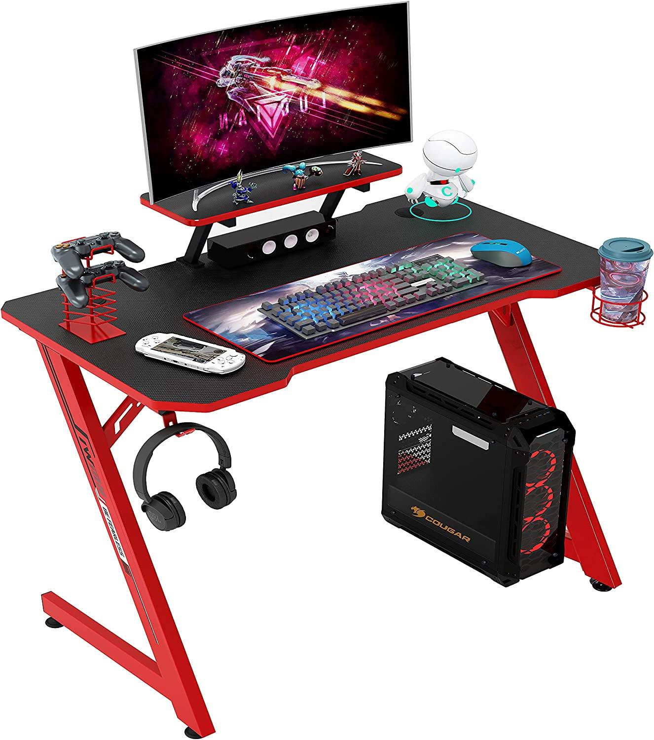| Name | IntimaTe WM Heart Gaming Tisch 110cm, Ergonomischer Computertisch, Schreibtisch mit Tischplatte aus Kohlefaser, Drehbarer Headsethalter, Griffhalter und Getränkehalter (Schwarz und Rot) |