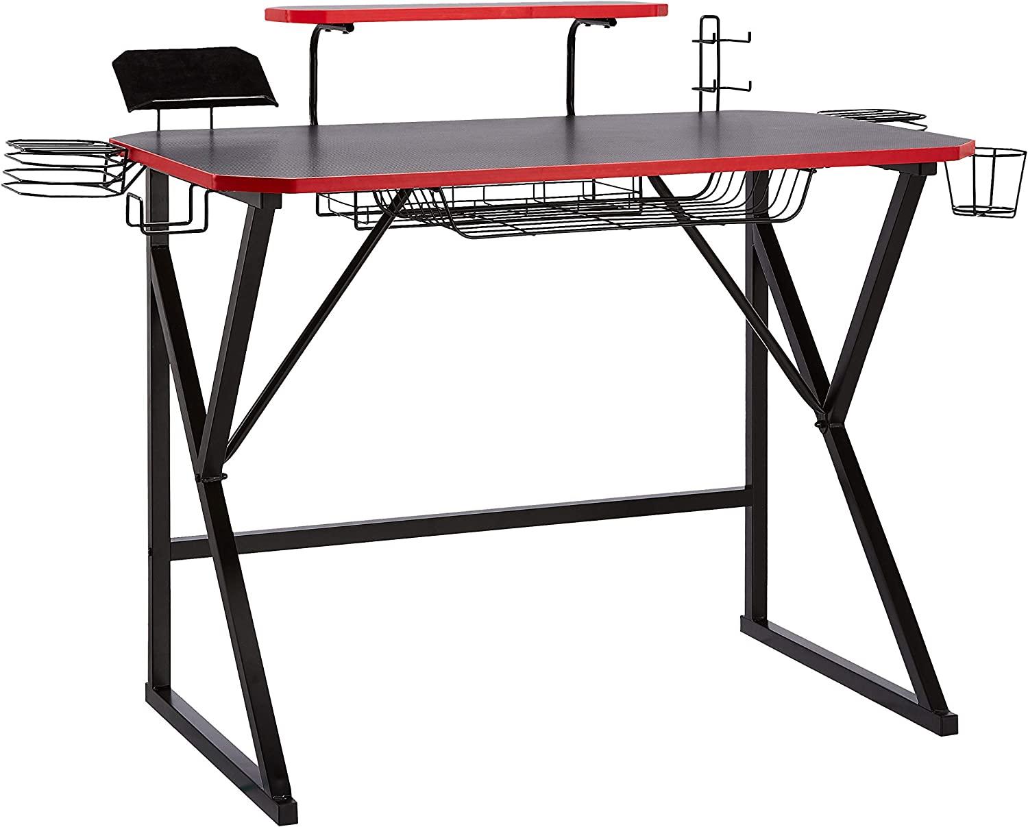 Amazon Basics – Gaming-Computertisch mit Aufbewahrung für Controller Kopfhörer und Lautsprecher, rot