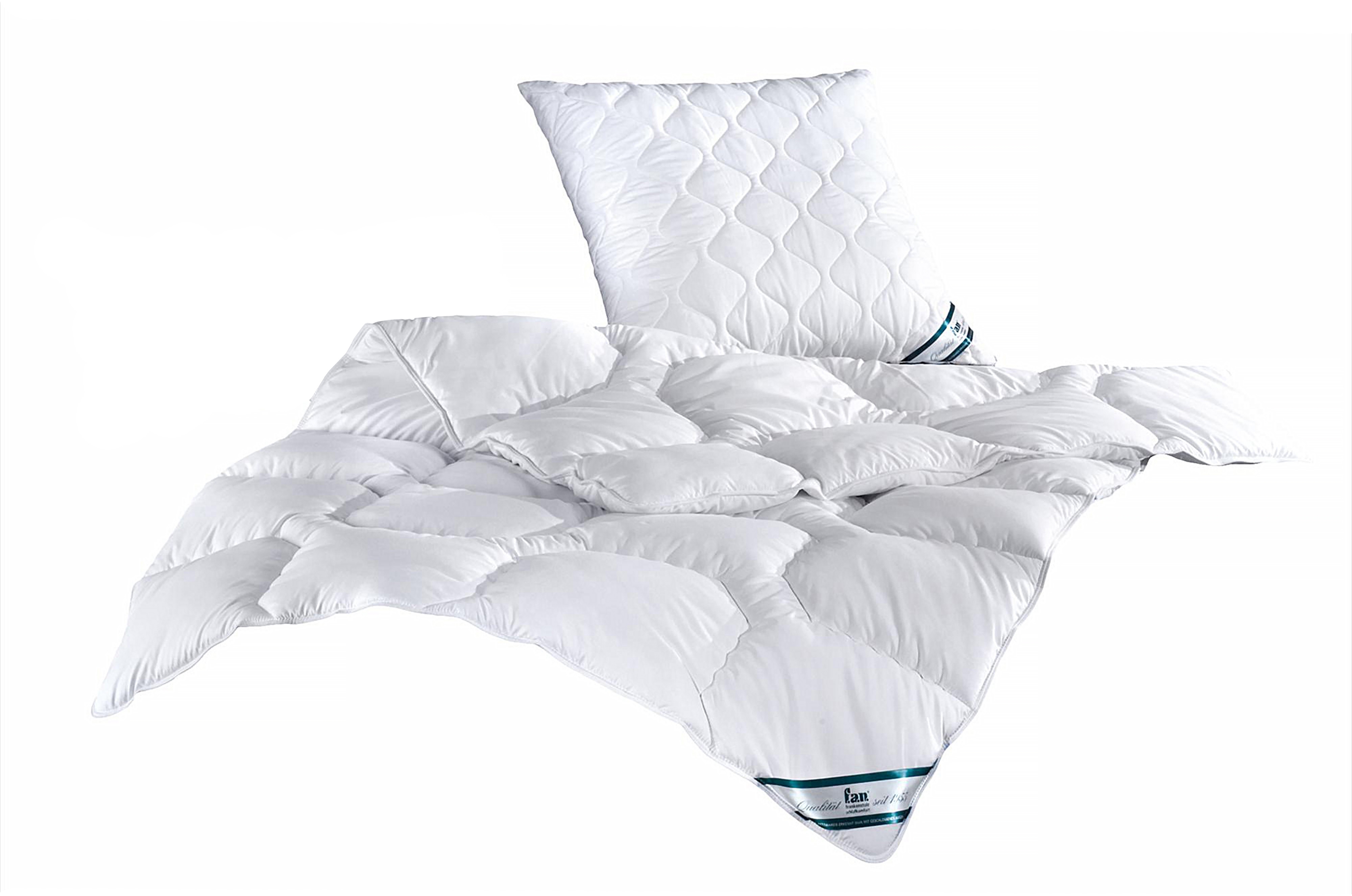 ## f.a.n. Kansas – Steppbett aus 100% Microfaser, kochfest und trocknergeeignet, auch für Allergiker, Ausführung: Vierjahreszeiten-Steppbett, Größe: 200 x 200 cm **Kuschelig eingebettet** Das Steppbett Kansas von f.a.n. ermöglicht einen schnellen Feuchtigkeitstransport und hält trotzdem angenehm warm. Das flauschige Microfasergewebe mit Peach-touch und die anschmiegsame Füllung sorgen für ein kuscheliges Wohlgefühl und einen guten Schlaf! ## Artikel im Detail * 4 Varianten: Leicht-Steppbett, Steppbett, Duo-Steppbett, Vierjahreszeiten-Steppbett * Supersoftige Microfaser * Peach-touch Effekt * Sehr schneller Feuchtigkeitstransport * Bezug: Microfaser-Feinbatist uni (100 % Polyester) * Farbe: 10 weiß * Füllung: Eurofill Markenhohlfaser silikonisiert (100 % Polyester) * Beim Vierjahreszeiten-Steppbett sind beide Decken durch Druckknöpfe miteinander verbunden * Allergikergeeignet ### Füllgewichte **Leicht-Steppbett:** * 135x200 cm: 480 g * 155x220 cm: 600 g * 200x200 cm: 700 g **Steppbett:** * 135x200 cm: 1.000 g * 155x220 cm: 1.200 g * 200x200 cm: 1.450 g * 200x220 cm: 1.550 g * 240x220 cm: 1.750 g **Duo-Steppbett:** * 135x200 cm: 1.150 g * 155x220 cm: 1.400 g * 200x200 cm: 1.600 g * 200x220 cm: 1.800 g * 240x220 cm: 2.200 g **Vierjahreszeiten-Steppbett:** * 135x200 cm: 750/480 g * 155x220 cm: 900/600 g * 200x200 cm: 1.050/700 g * 200x220 cm: 1.150/770 g * 240x220 cm: 1.350/910 g ### Pflege Kochfest bis 95 °C + trocknergeeignet ### Hinweise Dieses Angebot gilt für eine Decke ohne Kissen.