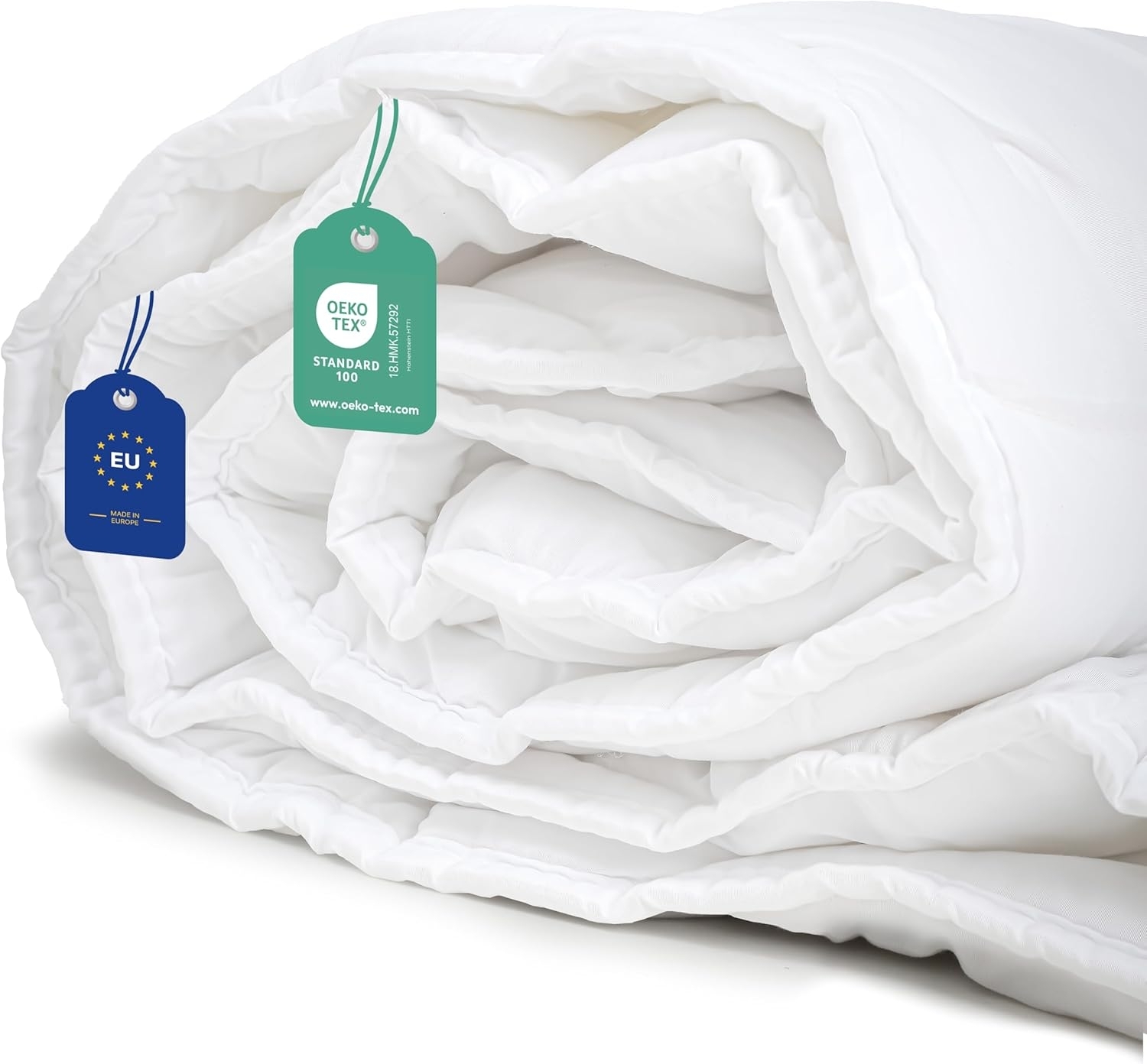| Beschreibung | **Die Livessa Mikrofaser-Bettdecken** bieten eine perfekte Kombination aus **Komfort, Funktionalität und Pflegeleichtigkeit** – ideal für erholsamen Schlaf das ganze Jahr über. Mit einer Innenfüllung aus hochwertigen **Hohlfasern (300g/m²)** bieten diese Bettdecken eine optimale Wärmeisolierung und passen sich perfekt jeder Jahreszeit an, ohne dass Sie für jede Saison eine separate Decke benötigen. So sparen Sie Platz und genießen dennoch jederzeit den **perfekten Schlafkomfort**. Der Bezug aus hochwertigem **Mikrofasergewebe** fühlt sich angenehm auf der Haut an und sorgt für ein weiches, kuscheliges Gefühl. Die Bettdecken sind **atmungsaktiv** und regulieren sowohl Temperatur als auch Feuchtigkeit, um stets ein angenehmes Schlafklima zu gewährleisten. Dank der praktischen Pflegeeigenschaften sind die Bettdecken **bis 60°C waschbar**, **trocknergeeignet** und benötigen **kein Bügeln**. Sie können die Decke problemlos bei niedrigen Temperaturen im Trockner trocknen – ideal für eine unkomplizierte Reinigung. Die Livessa Mikrofaser-Bettdecke ist nach **OEKO-TEX Standard 100** zertifiziert, was sie besonders verträglich und frei von schädlichen Substanzen macht. Ideal für alle, die Wert auf **nachhaltigen Schlafkomfort** legen. Erleben Sie den Luxus einer **hochwertigen Ganzjahres-Bettdecke**, die Sie das ganze Jahr über begleitet – für ruhige Nächte und erholsamen Schlaf. |