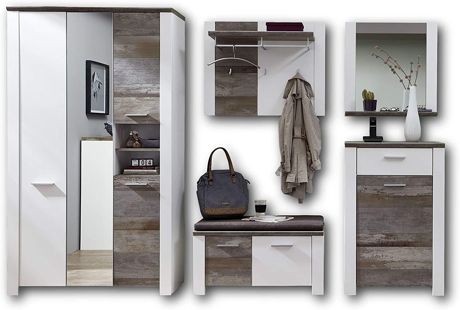 | Name | Garderobe Set MATEO2 5-tlg Schrank Paneel Spiegel Kommode Bank weiß Driftwood |